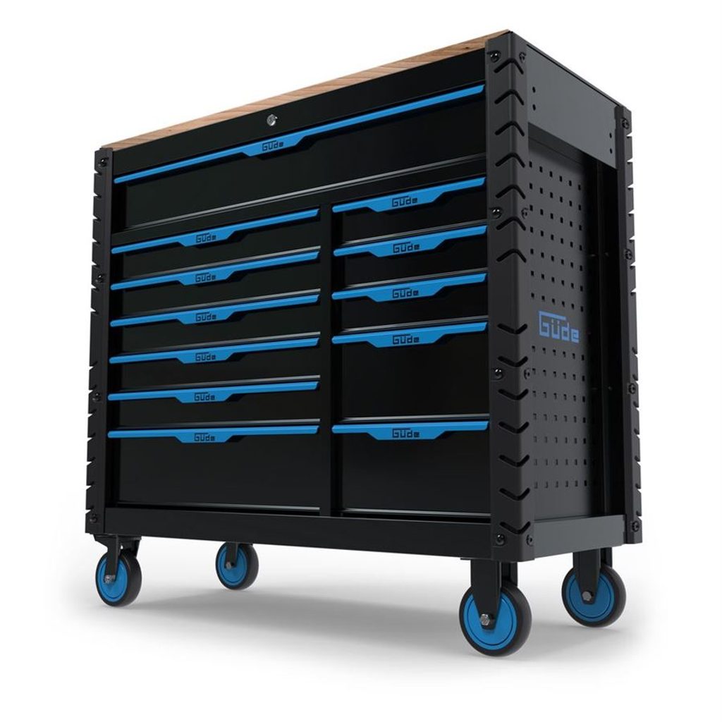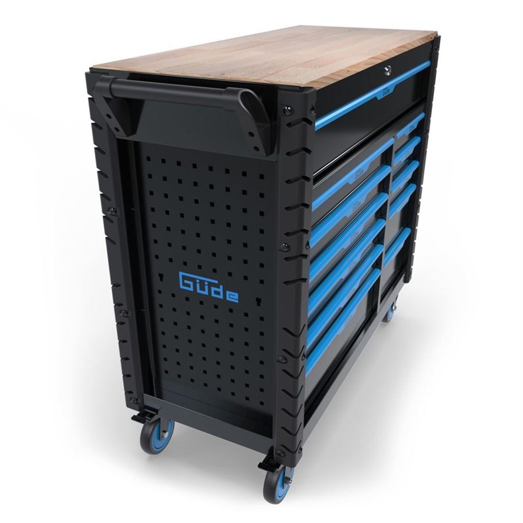 Dílenský vozík GÜDE GW 12S 39140 vyniká svými 12 zásuvkami různých velikostí, poskytujícími dostatek prostoru pro veškeré vaše nářadí. Zásuvky jsou vybaveny měkkým zavíráním a plnovýsuvnými pojezdy na kuličkových ložiscích, což zaručuje plynulé otevírání a zavírání. Díky centrálnímu zamykání a dvěma klíčům můžete mít jistotu, že vaše nářadí zůstane v bezpečí. Masivní pracovní deska z kaučukového dřeva poskytuje odolný povrch pro všechny druhy prací.