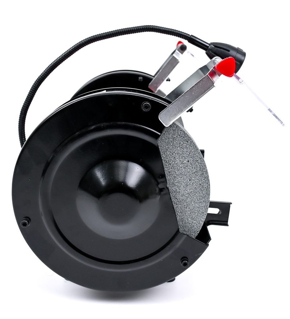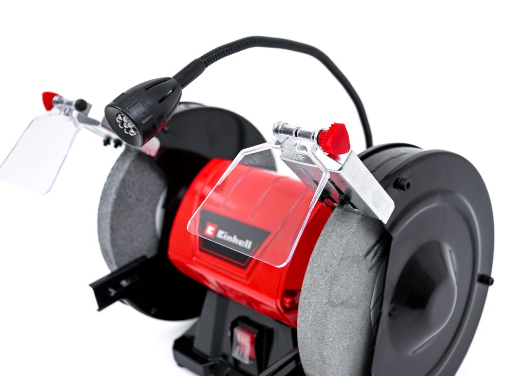 Bruska je vybavena dvěma kvalitními brusnými kotouči poháněnými výkonným a spolehlivým motorem. Díky robustní kovové konstrukci a hřídeli uložené v kuličkových ložiskách s nulovou vůlí nabízí dlouhou životnost a precizní výsledky. O bezpečnost během provozu se starají nastavitelné štíty proti jiskrám a postranní kryty, které lze snadno upravit bez použití nářadí. Stabilitu zajišťují gumové nožičky, které účinně tlumí vibrace.