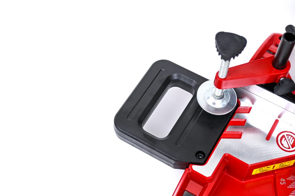 Sáček na piliny udržuje pracoviště čisté, zatímco prachový trychtýř za pilovým kotoučem je dalším velkým krokem v účinnosti odstraňování pilin. Pro snadnou a bezpečnou mobilitu je k dispozici přepravní vzpěra.