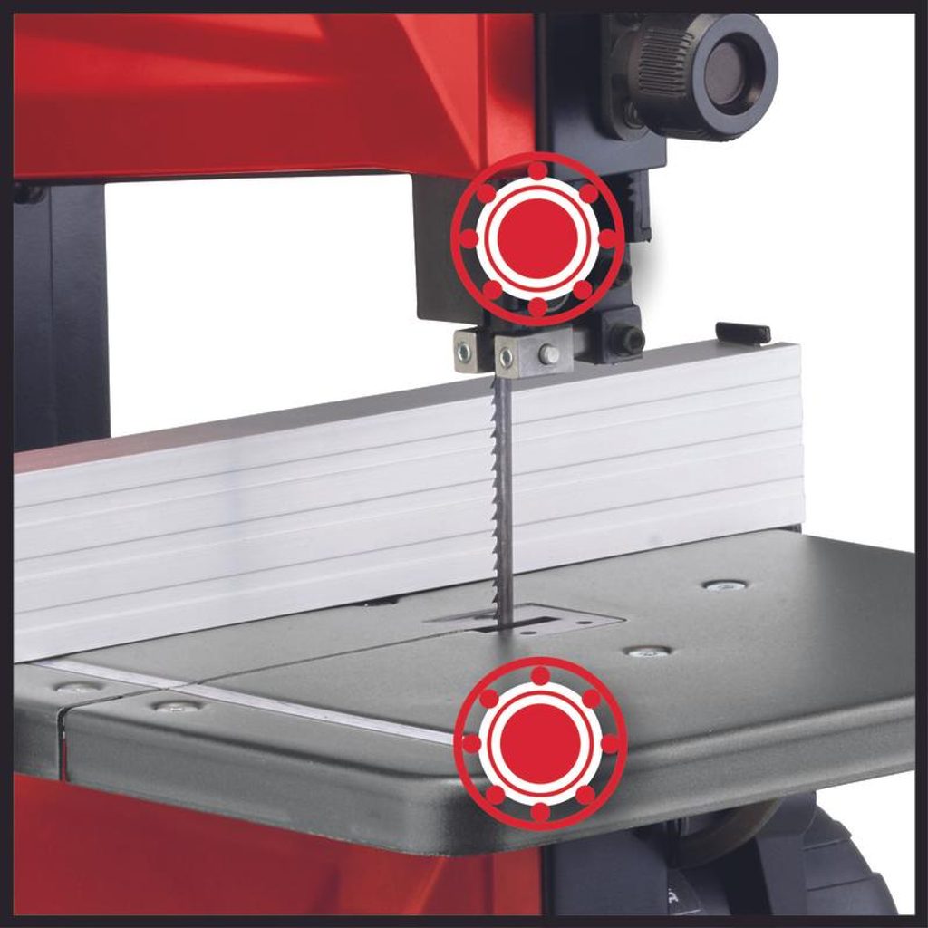 Pásová pila je vybavena vícenásobně nastavitelným stabilizátorem pilového pásu, který snižuje vibrace a přispívá k čistému, jemnému řezu.