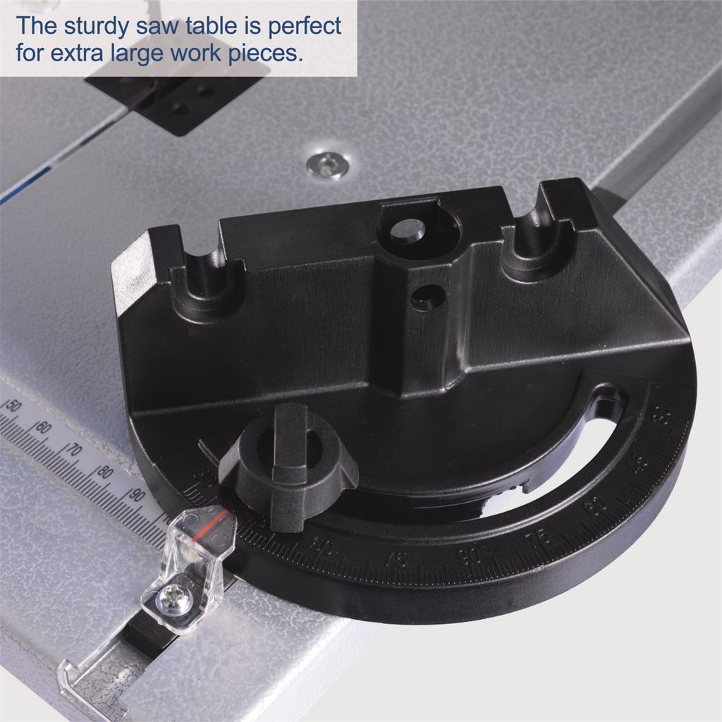 Rozšiřovací pracovní stůl pily je možné naklápět od 0° do 45° a rozšiřovat mezi 380 a 540 mm, což poskytuje flexibilitu pro různé druhy řezů. Pro rovné řezy je vybaven posuvným pravítkem s rychloupínací pákou, které je upevněno na obou stranách stolu pro maximální přesnost.