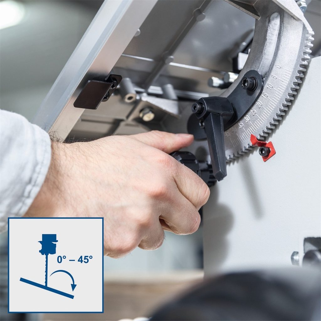Naklápěcí stůl v rozsahu 0° až 45° je vyroben z odolné hliníkové slitiny, navíc ho lze prodloužit pro lepší oporu při práci s větším materiálem. Ve výbavě nechybí pevné posuvné pravítko s rychloupínáním ani přesné úhlové pravítko, zatímco celokovová konstrukce přispívá k dlouhé životnosti a minimálním vibracím.