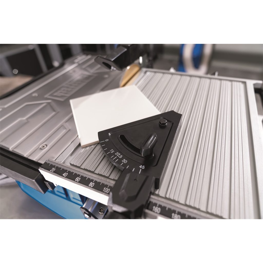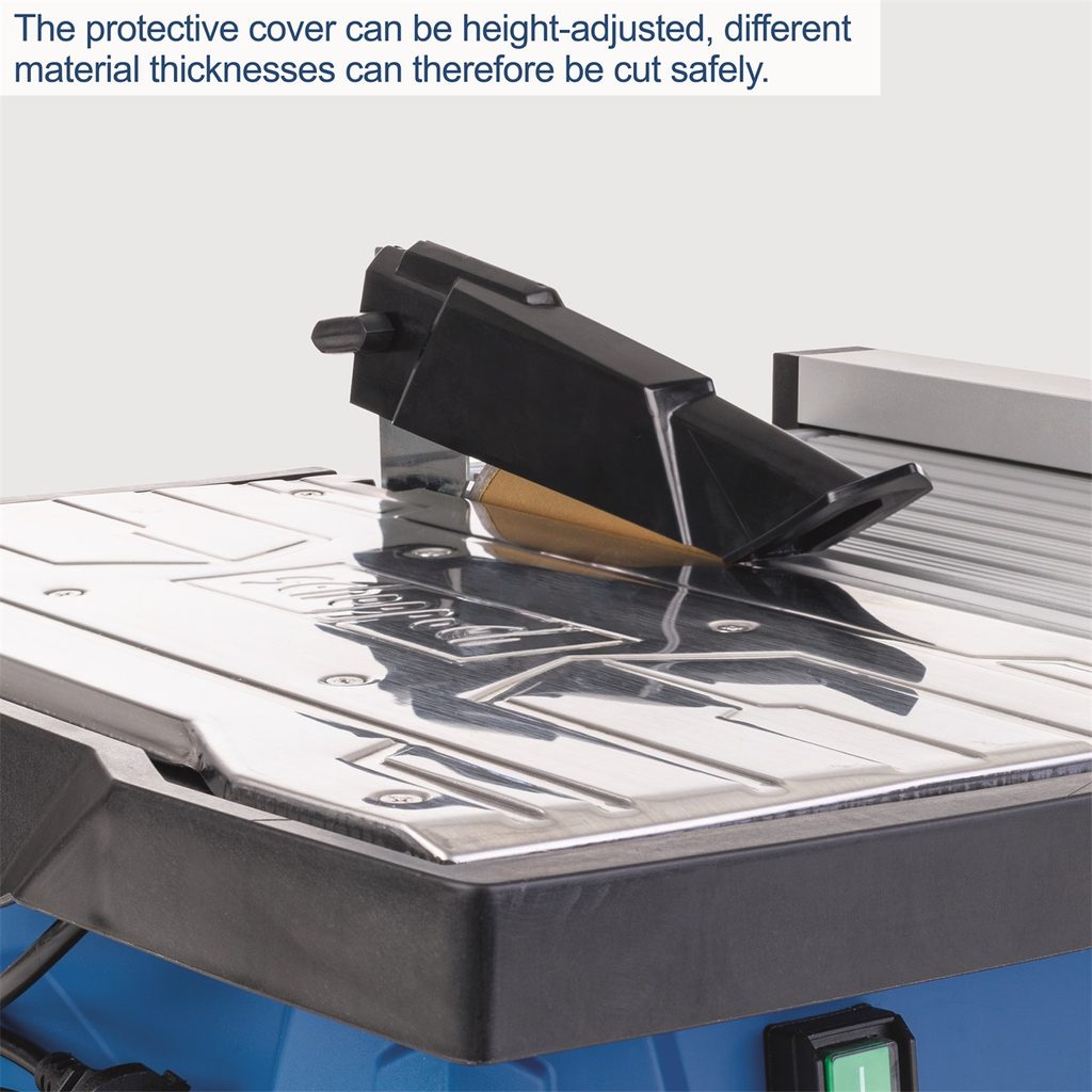 Pracovní stolek je vybaven přesnou milimetrovou stupnicí, úhlovým pravítkem s integrovanou stupnicí pro řezání pod úhlem a praktickým bočním dorazem. Prémiový diamantový kotouč je pevně uchycen, což zajišťuje vysokou přesnost při dlouhých řezech. Kryt kotouče lze výškově nastavit podle tloušťky materiálu, což přispívá k bezpečnosti a efektivitě práce.