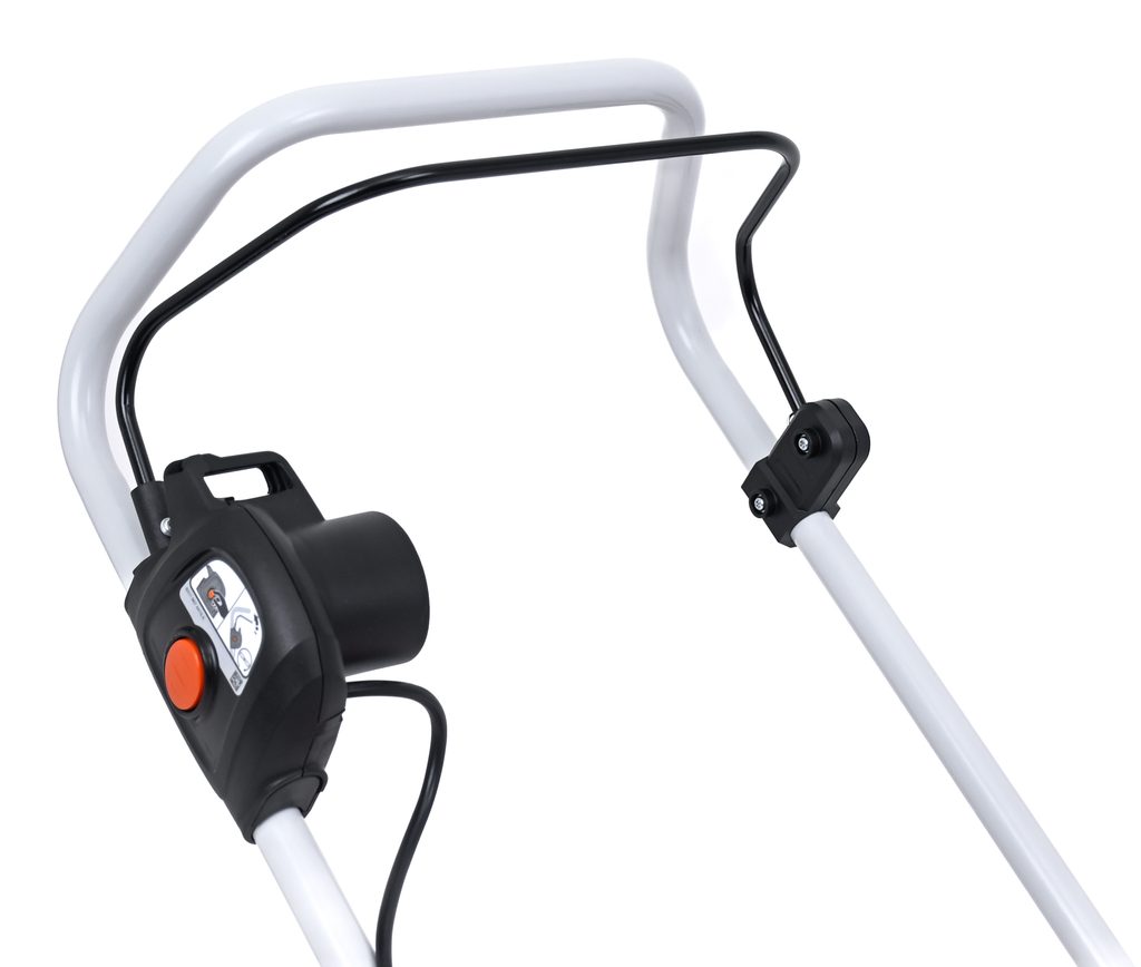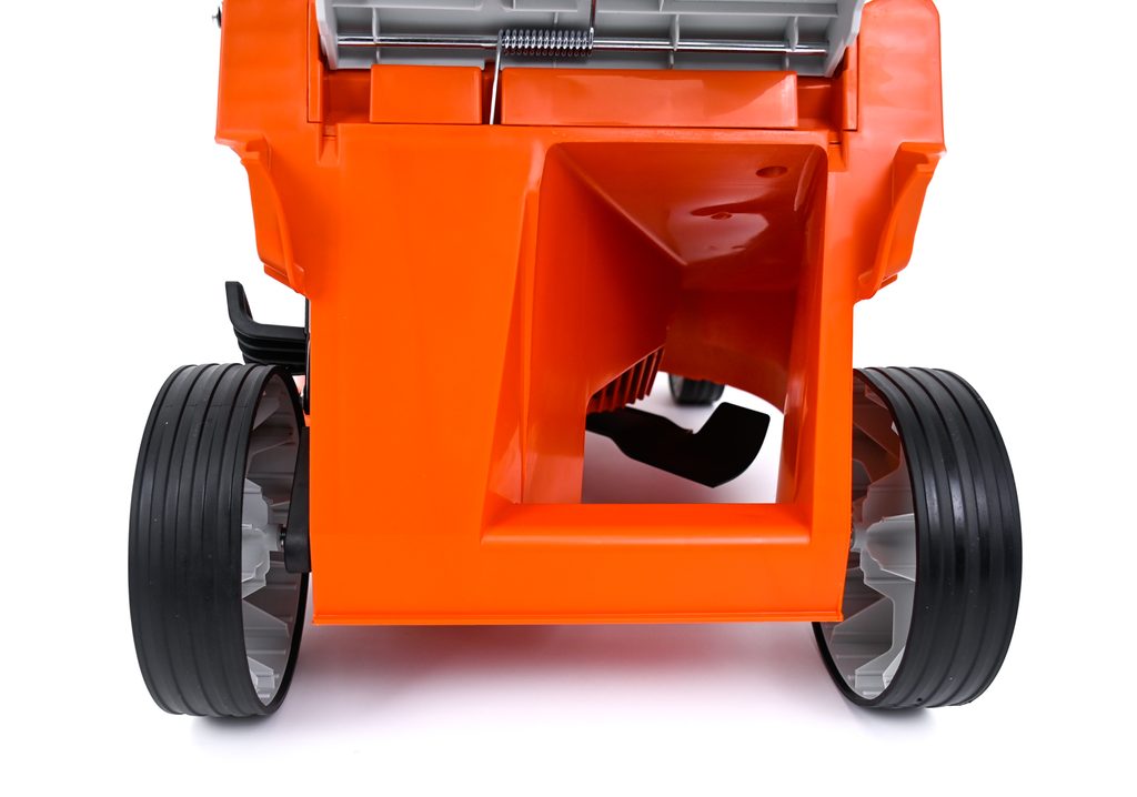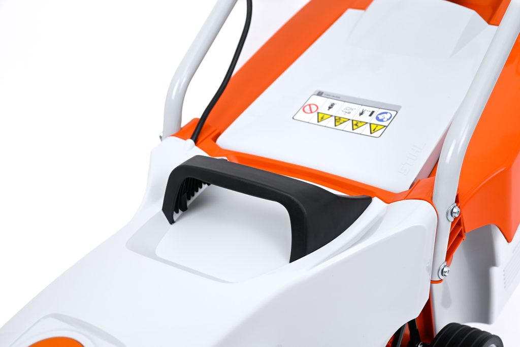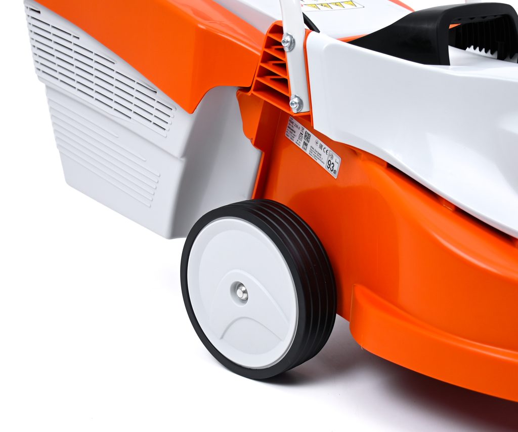 Výšku sečení lze centrálně nastavit v rozmezí 25-65 mm. Dvoustupňově výškově nastavitelná rukojeť pro přizpůsobení se výšce uživatele a pro pohodlnou práci. Robustní pojezdová kola s trakčním vzorkem vynikají dlouhou životností, udržují stabilní směr při jízdě současně se zachovanou perfektní manévrovatelností.