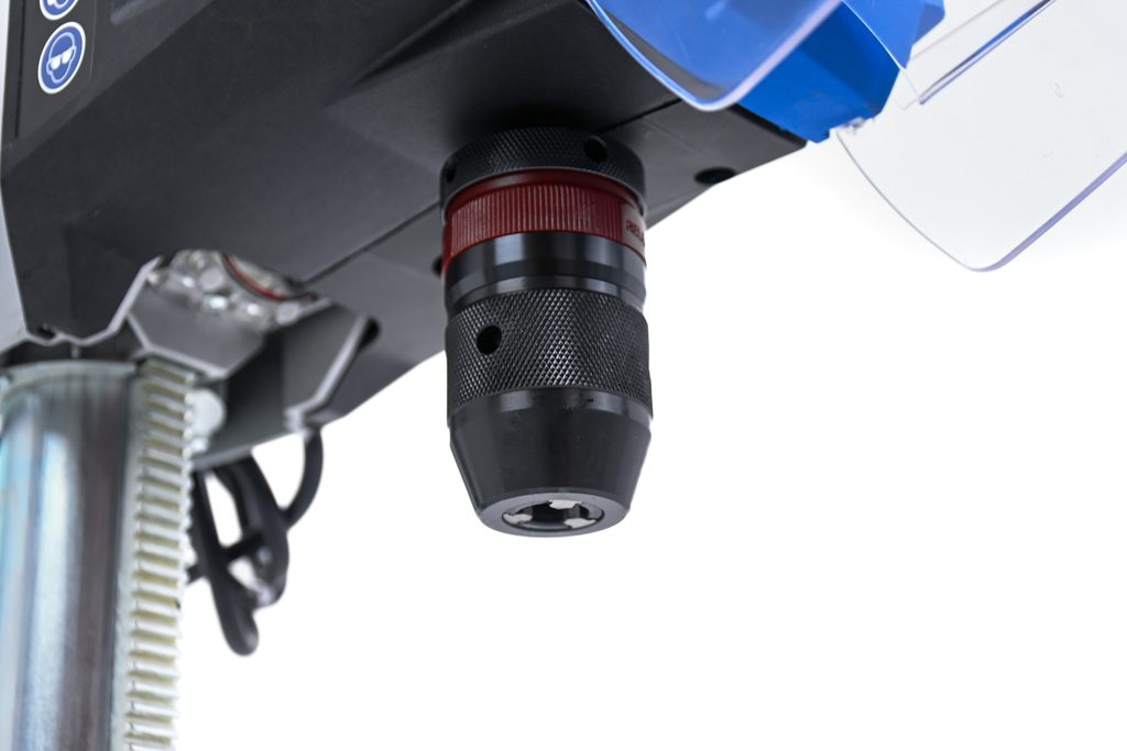 Přesnost práce vám zvýší i přesný křížový laser, LED osvětlení pracovního prostoru, velké otočné madlo (lze namontovat z obou stran pro praváky i leváky) s měkčenou protiskluzovou úpravou a profesionální rychloupínací sklíčidlo s automatickým utahováním vrtáku.