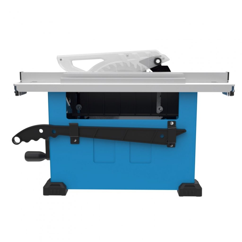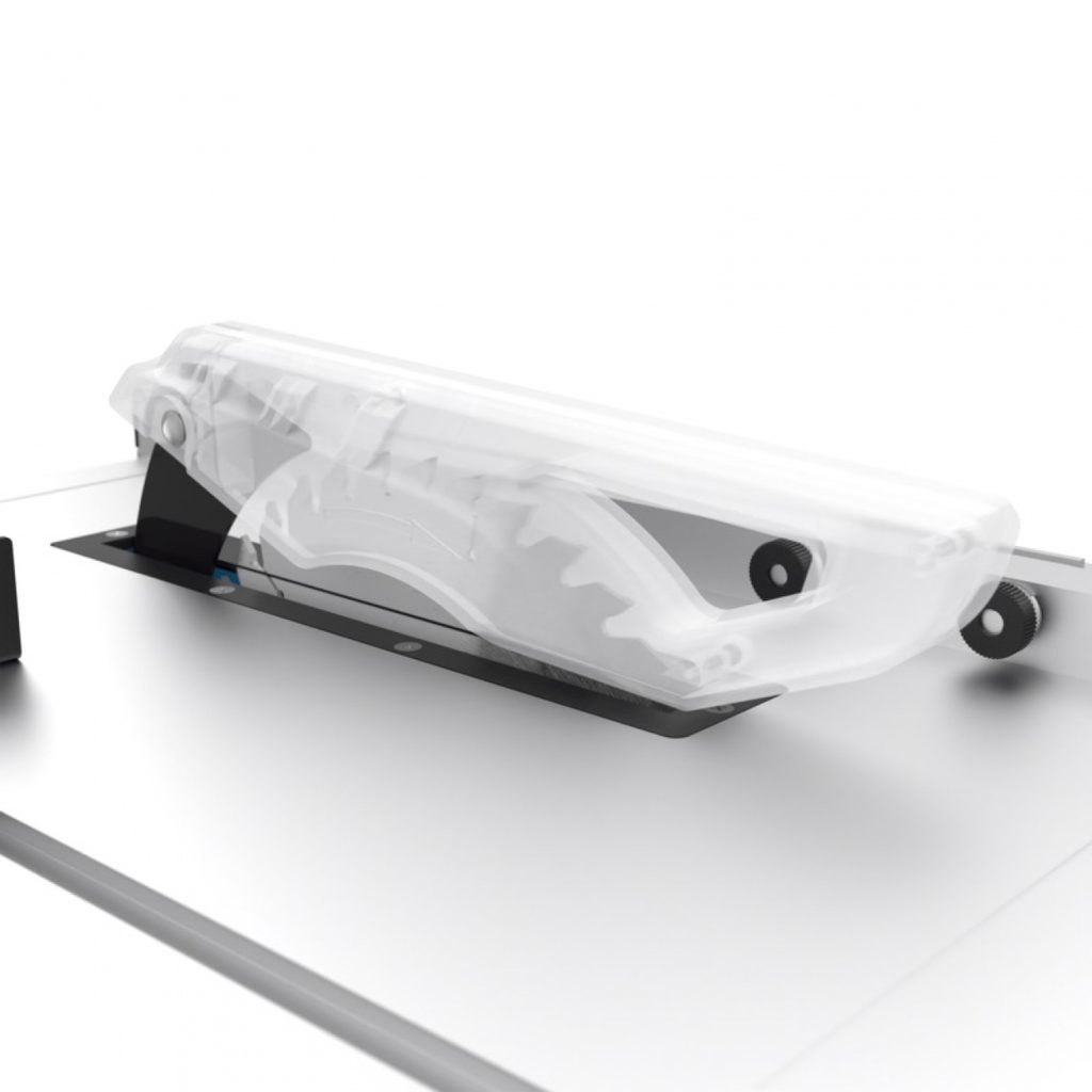 Má plynulé nastavení řezné výšky (úhlu sklonu) pilového kotouče ruční klikou a ocelový stůl 440 x 530 mm se dvěma milimetrovými měřítky.