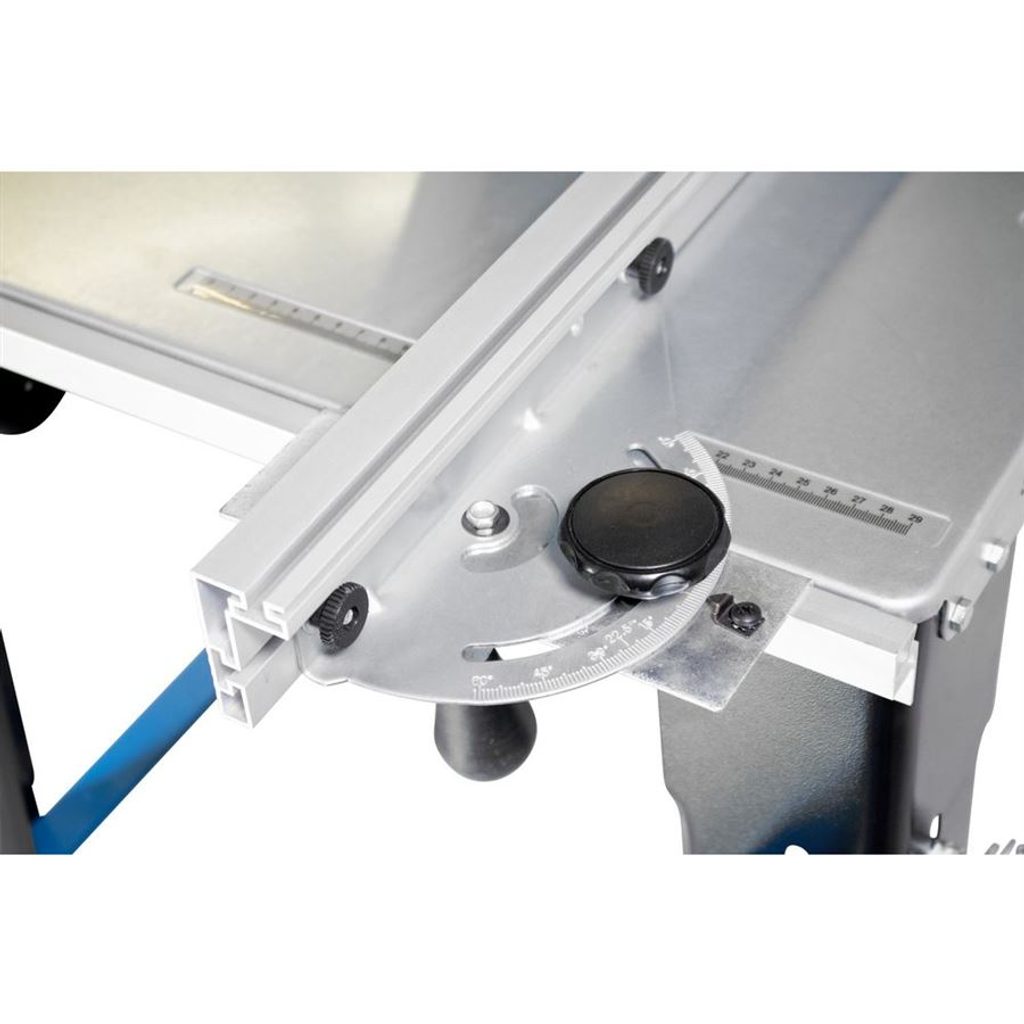 Má plynule nastavitelnou výšku/úhel sklonu pilového kotouče 90° - 45° (řezy na pokos), pozinkovaný pracovní stůl (d x š: 800 x 553 mm), snadná manipulace díky pojezdovým kolům/výklopným transportním rukojetím.