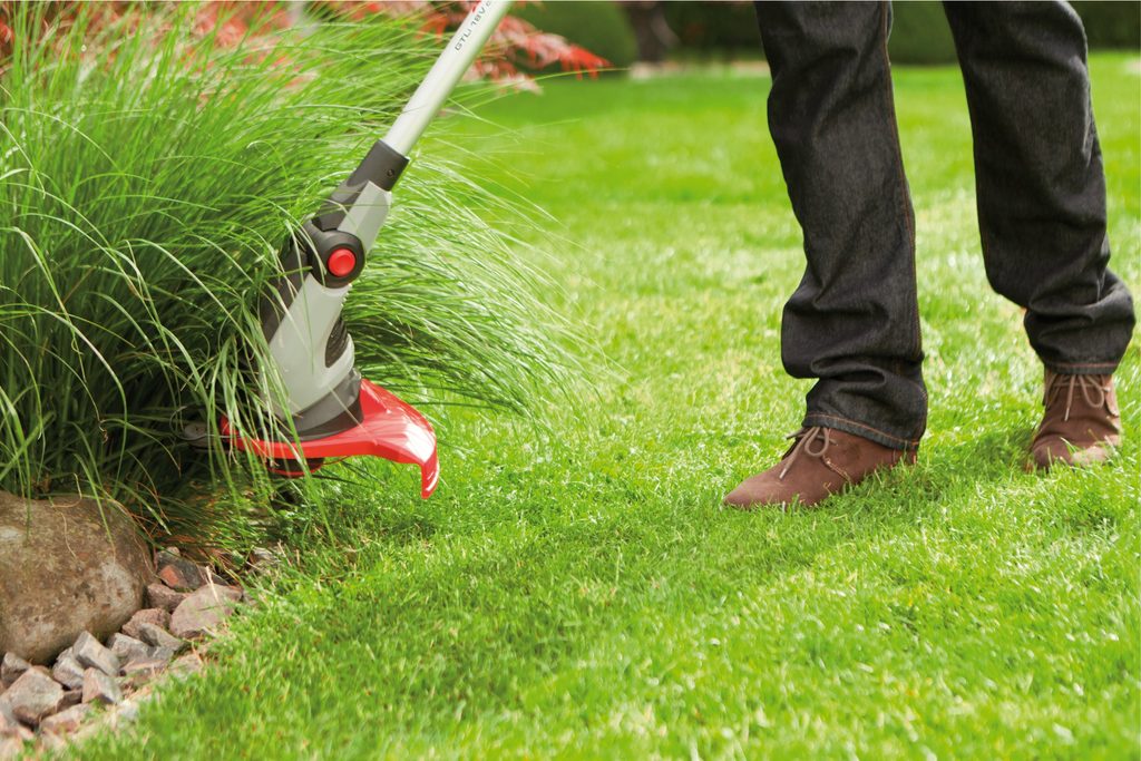 Flexibilní, výklopná a otočná (180 st.) strunová hlava se šířkou záběru 30 cm s ochranným rámem proti nechtěnému posečení rostlin dělají z této sekačky ideálního pomocníka pro dosekávání okolo křoví, zdí, plotů a okrajů trávníku.