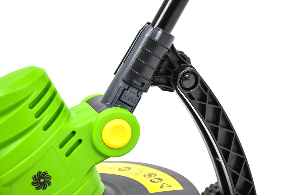 Balení sekačky obsahuje cívku plně navinutou strunou a sekačka je tak připravena k okamžitému použití. Úhel žací hlavy je díky kloubu nastavitelný a umožňuje tak dosekání i hůře přístupných míst. Žací hlava je dále opatřena vodítkem, které zabraňuje nechtěnému posečení okrasných rostlin.