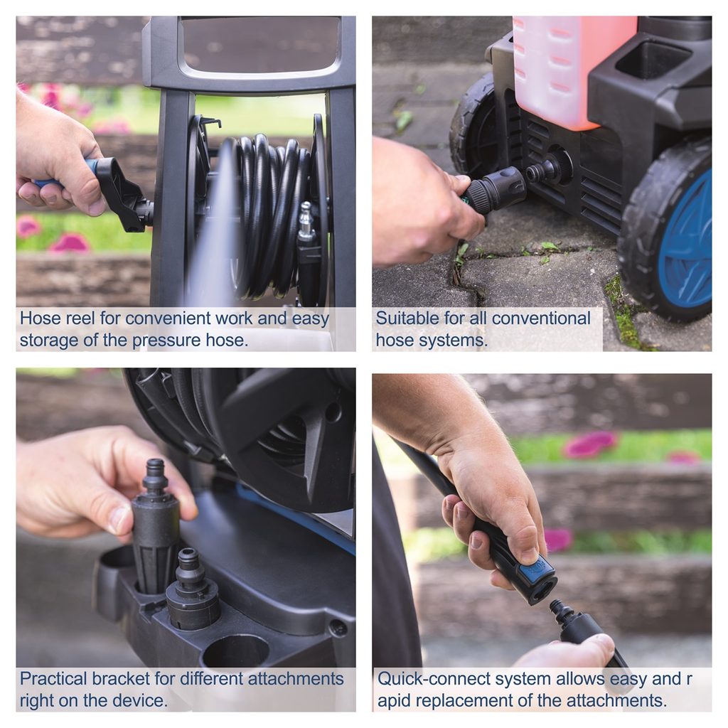 Myčka je osazena silným motorem s výkonem 2400 W, který umožňuje čerpadlu dosáhnout maximálního tlaku až 180 barů. Tento vysoký tlak je ideální pro zvládnutí i těch nejnáročnějších úklidových prací. Pro snadnou obsluhu jsou připojovací prvky a hadice vybaveny praktickými rychlospojkami. Při skladování lze základní příslušenství, jako je tlaková pistole nebo elektrický kabel, pohodlně umístit do integrovaných držáků na myčce. Tlaková hadice je navíc navinutá na otočném bubnu, což usnadňuje manipulaci.