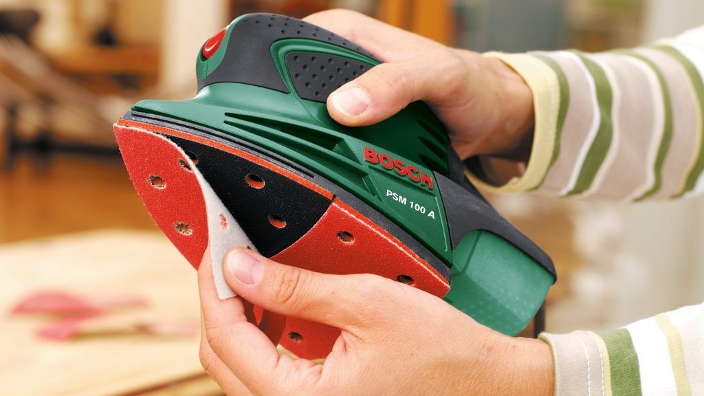 Elektrická vibrační bruska Bosch PSM 100 A je praktická multifunkční bruska s výkonem 100 W, ideální pro domácí dílnu i drobné renovační práce. Díky svému tvaru je skvělá na práci v rozích, na okrajích a na menších rovných plochách, kde se s většími bruskami nedostanete.