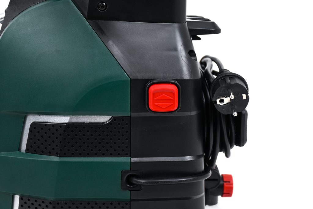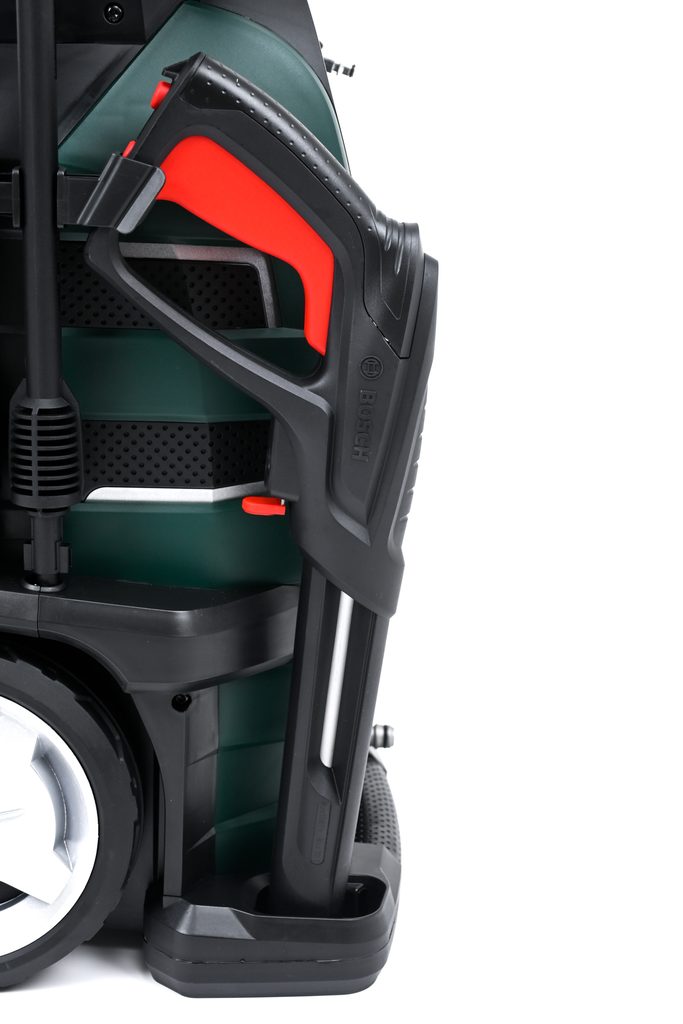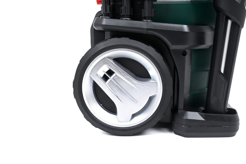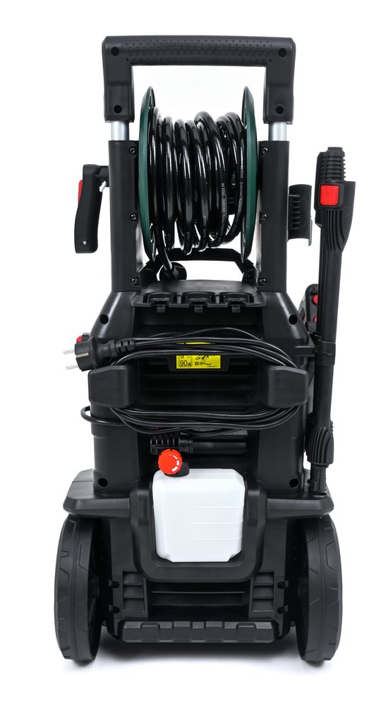 Snadné sestavení myčky díky vysokotlaké navíjecí hadici a rychlopřípojkám push-fit. Kovová teleskopická rukojeť a velká kolečka zajišťují lepší pohyblivost. Vysokotlaká tryska na čistící prostředky o objemu 550 ml zkracuje dobu čištění rychlou aplikací saponátu.