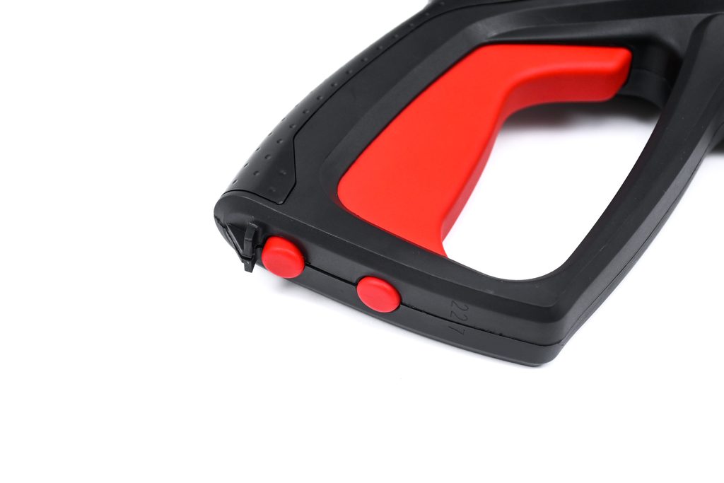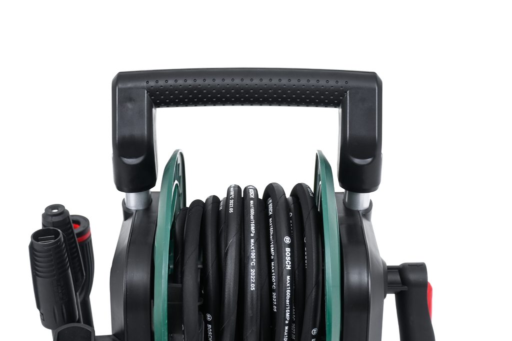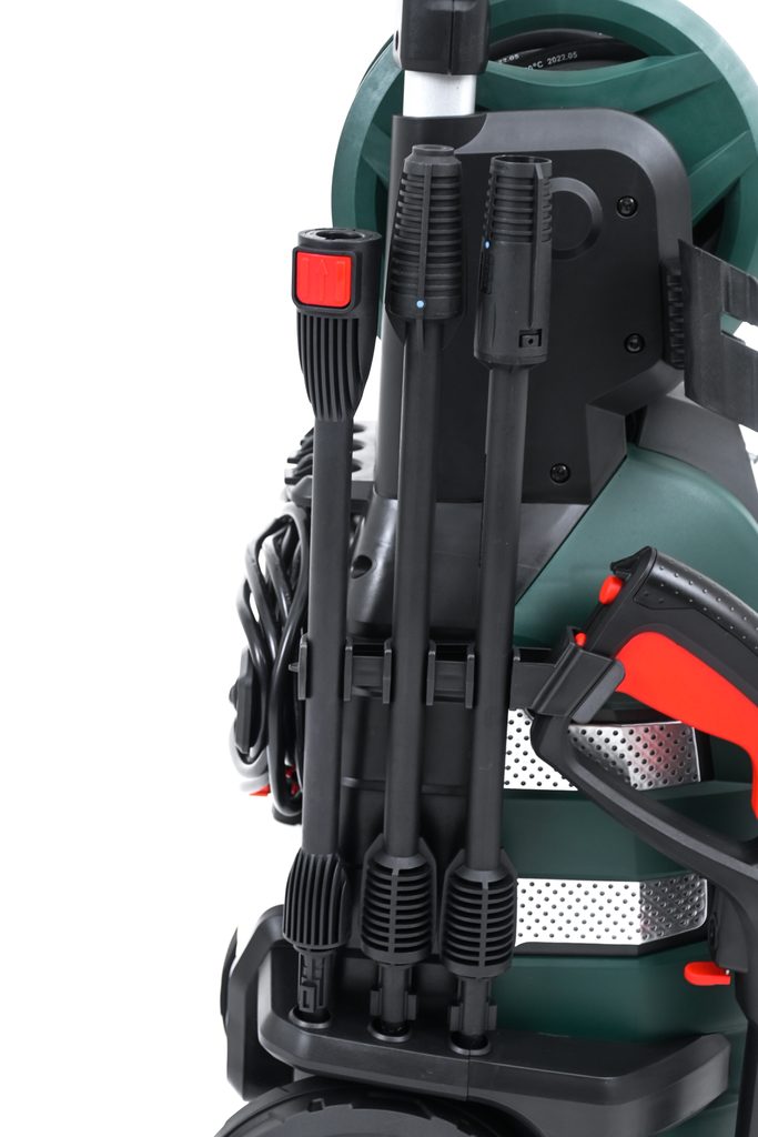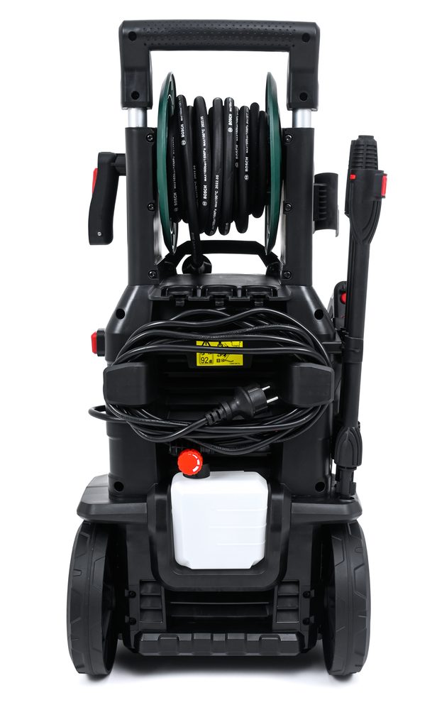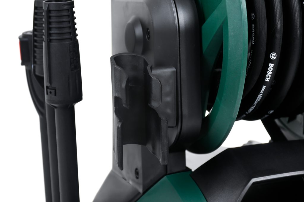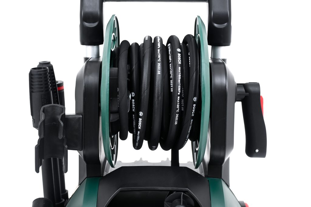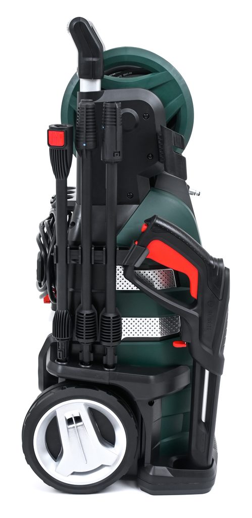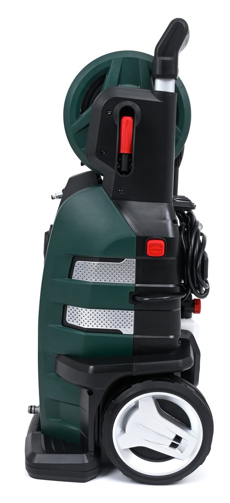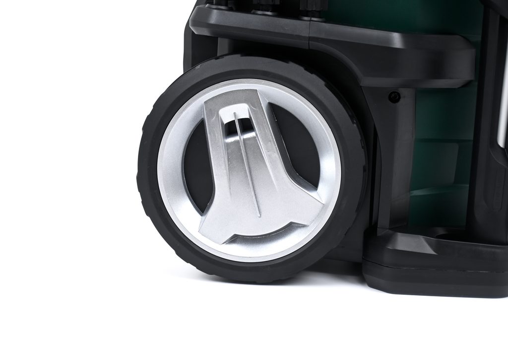 Snadné sestavení myčky díky vysokotlaké navíjecí hadici a rychlopřípojkám push-fit. Kovová teleskopická rukojeť a velká kolečka zajišťují lepší pohyblivost. Vysokotlaká tryska na čistící prostředky o objemu 550 ml zkracuje dobu čištění rychlou aplikací saponátu.