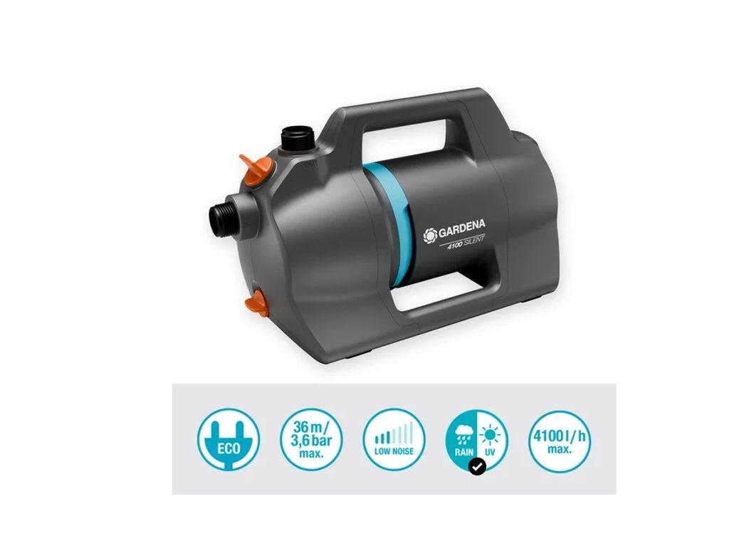 Gardena 4100 Silent je navrženo tak, aby bylo tiché. Nízkého hluku 50dB je dosaženo díky plastovému krytu tlumícímu zvuk a gumovým nožičkám, které zajišťují stabilitu a snižují vibrace. Ergonomická rukojeť umožňuje snadné přenášení čerpadla.