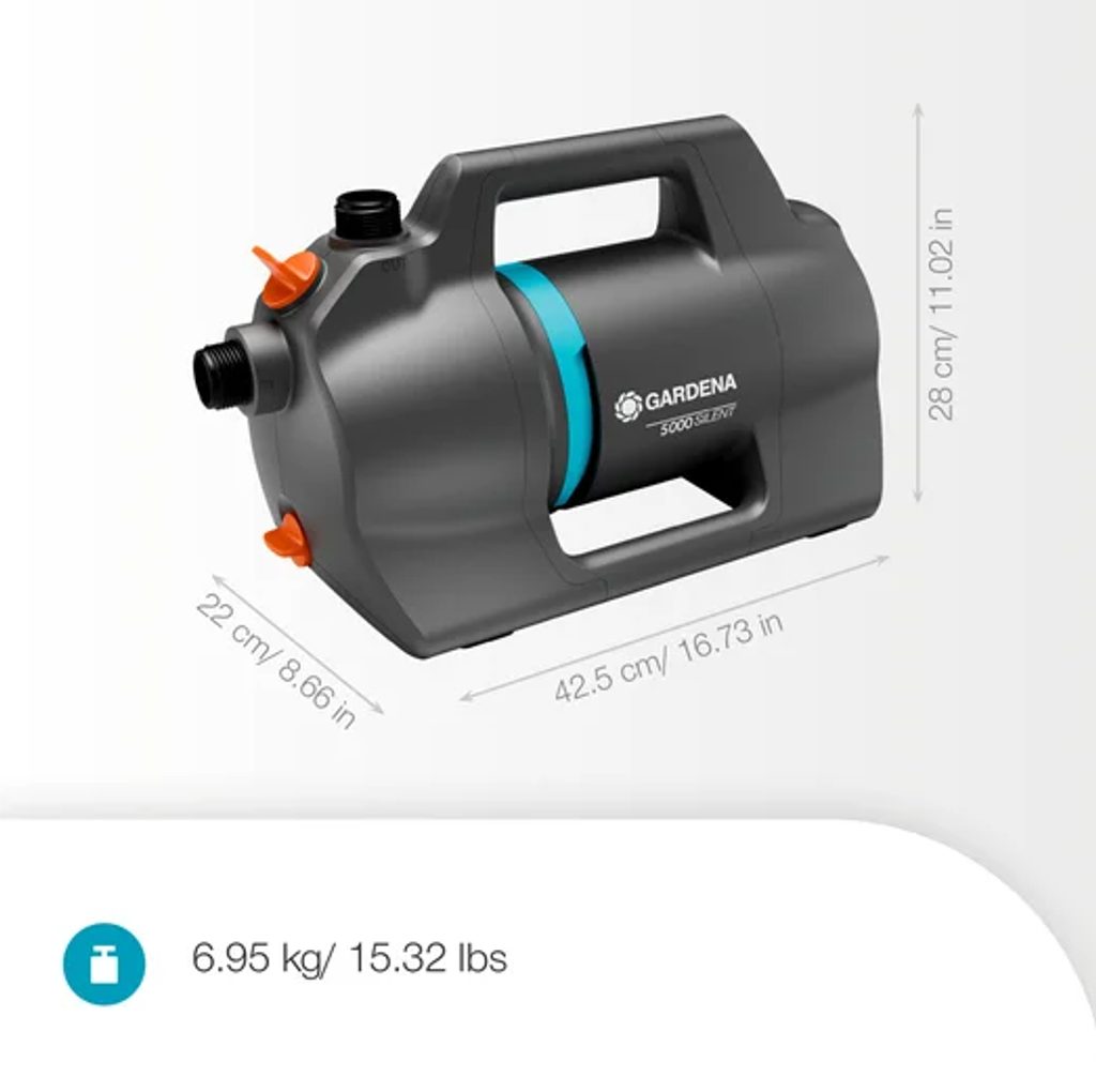 Elektrické povrchové čerpadlo Gardena 5000 Silent je zavlažovací čerpadlo s vysokým výkonem pro pohodlné čerpání vody na zahradě. Zvládá průtok až 5000 l/h a vytváří tlak 3,6 baru, přičemž díky vylepšené hydraulické konstrukci dosahuje až o 26 % vyššího průtoku než předchozí model v této řadě.