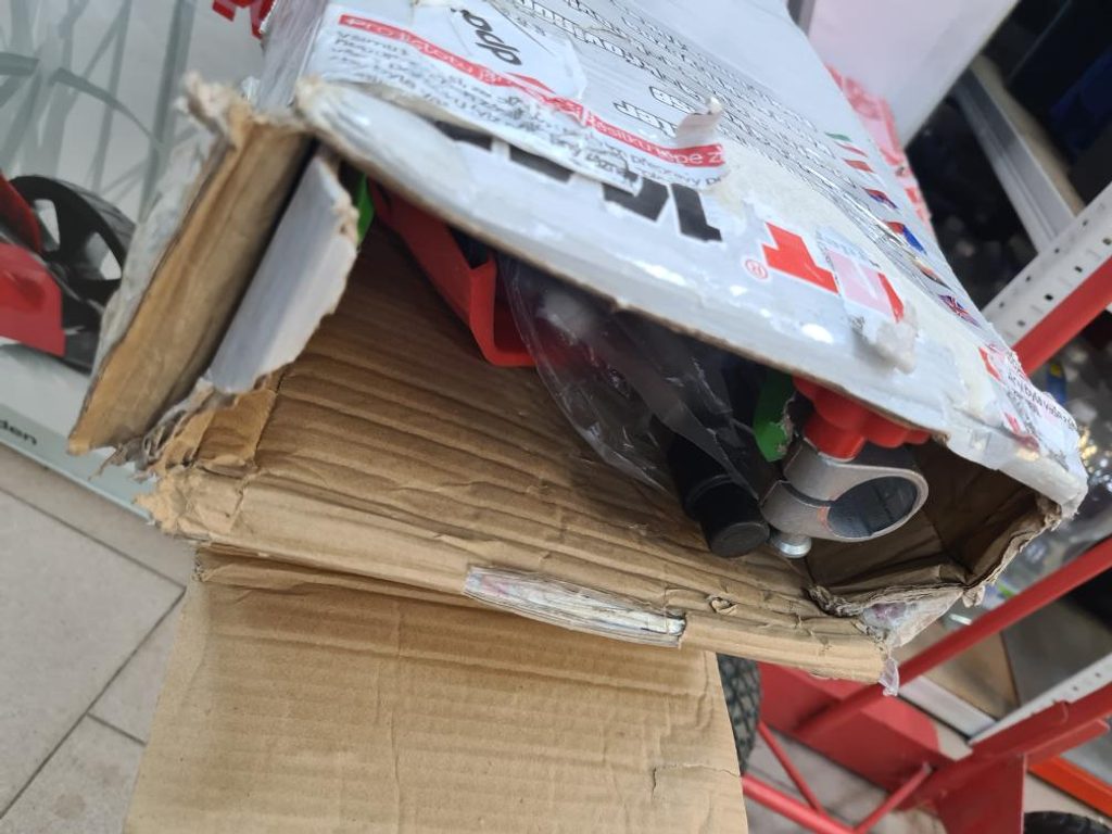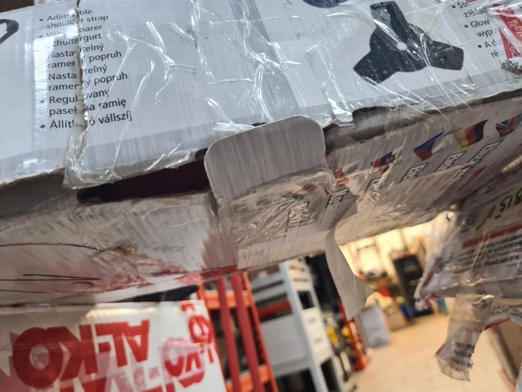 Strunová sekačka má poškozený obal od přepravy, má odřená řidítka, kompletní balení, kromě lehkých oděrek je 100%, oděrky nemají vliv na funkčnost.