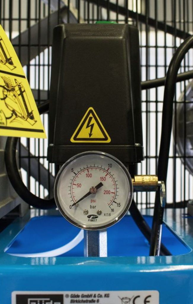 Pro maximální pohodlí a přesnost je kompresor vybaven tlakovým spínačem s ochranou motoru, redukčním ventilem pro přesné nastavení tlaku a dvěma manometry, jeden pro sledování tlaku v nádrži a druhý pro pracovní tlak. Tyto prvky umožňují snadné ovládání a přizpůsobení kompresoru konkrétním potřebám.