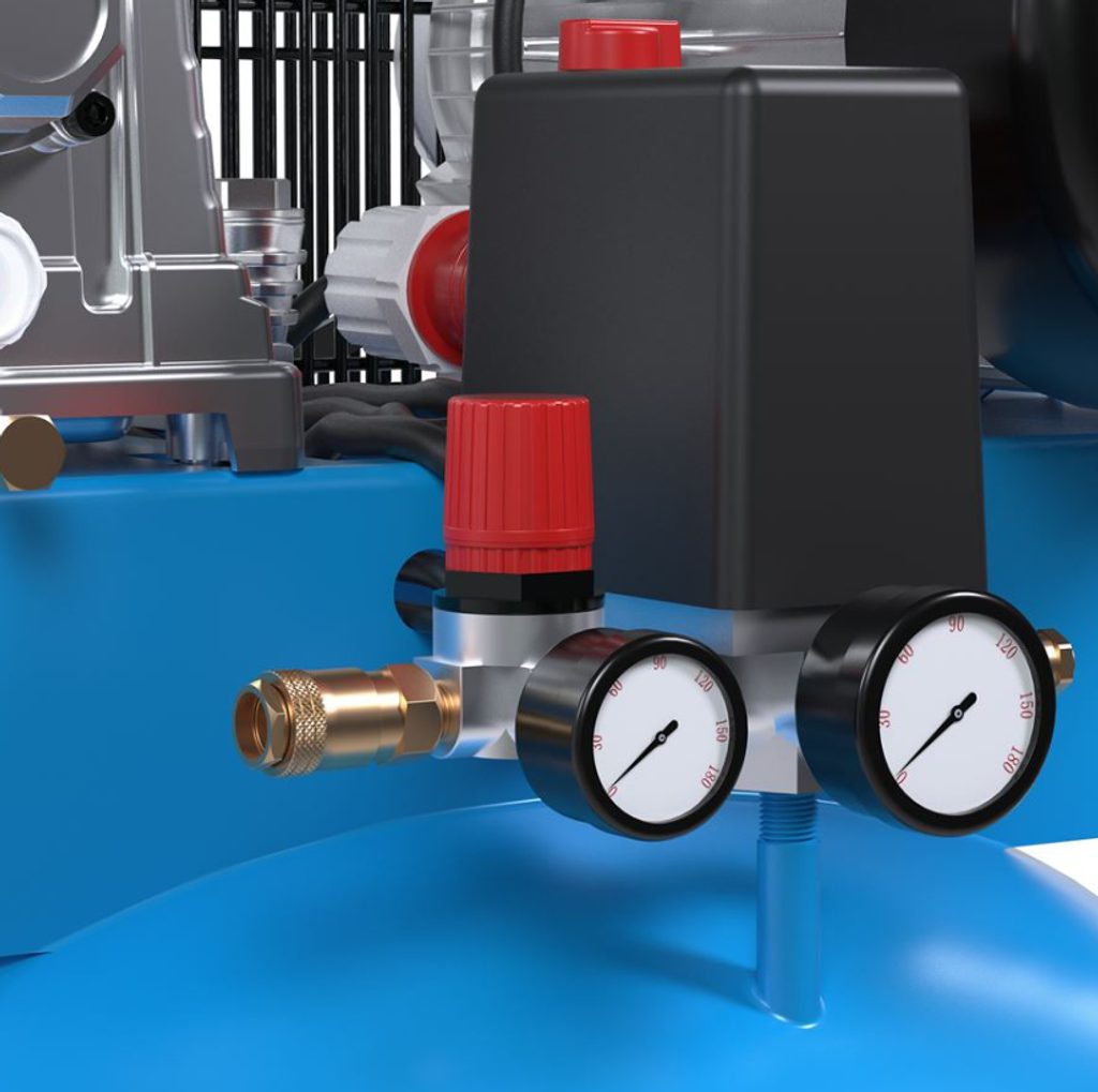 Pro maximální pohodlí a přesnost je kompresor vybaven tlakovým spínačem s ochranou motoru, redukčním ventilem pro přesné nastavení tlaku a dvěma manometry, jeden pro sledování tlaku v nádrži a druhý pro pracovní tlak. Tyto prvky umožňují snadné ovládání a přizpůsobení kompresoru konkrétním potřebám.
