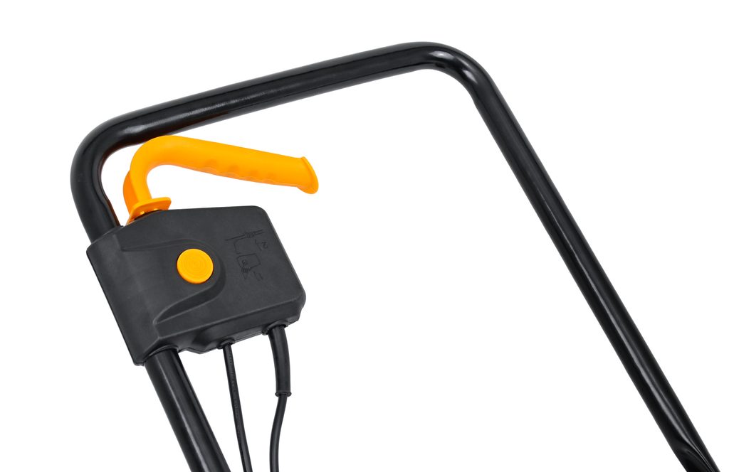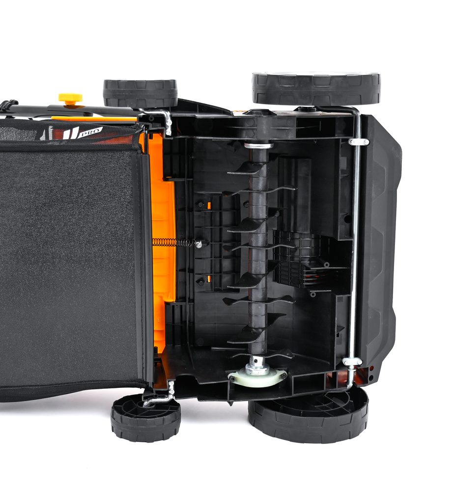 Široký výstupní otvor sběracího koše, výhozový tunel a madlo naopak zajistí snadné vysypávání vzniklého odpadu na kompost nebo na místo k tomu určené.