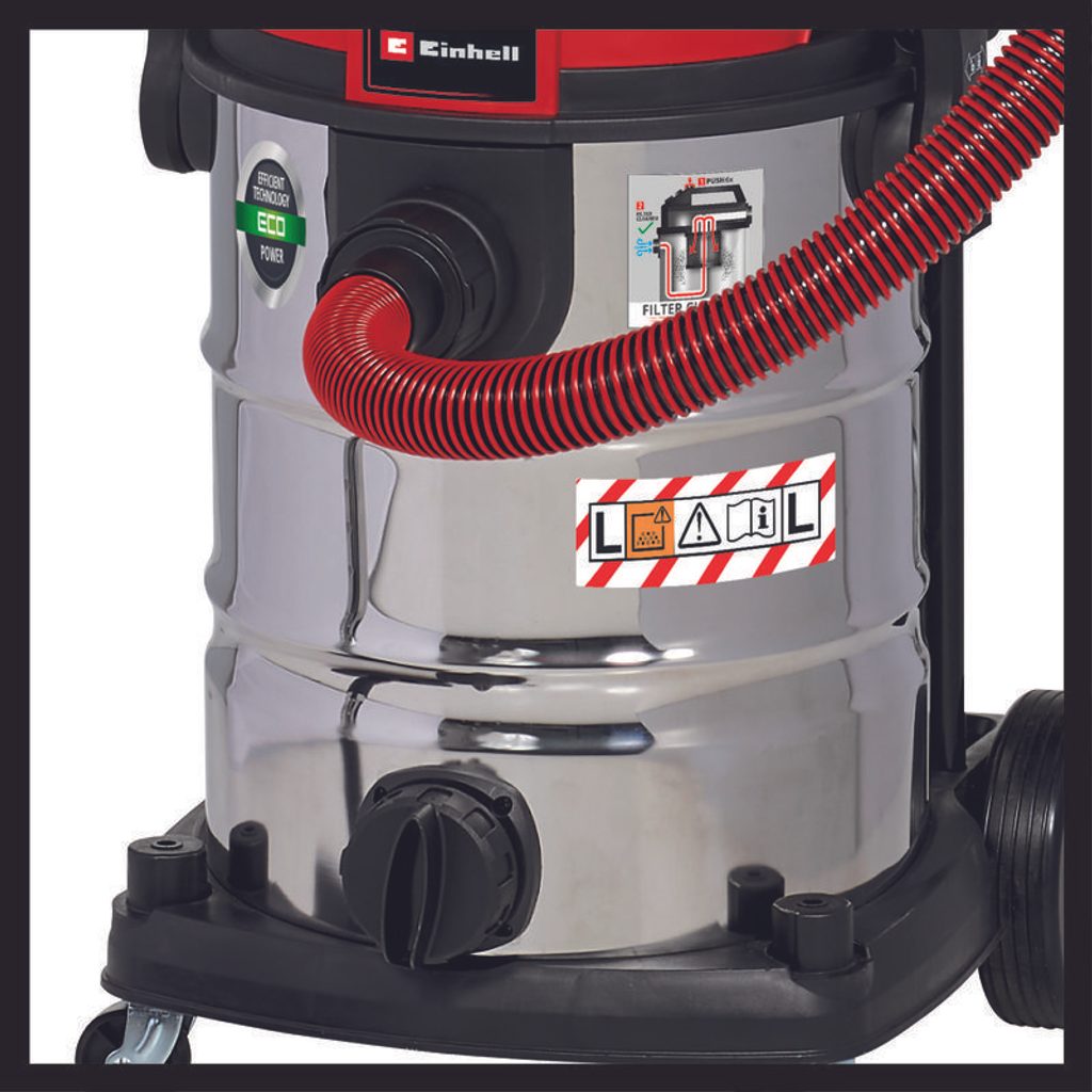 Vysoce kvalitní vysavač Einhell prachové třídy "L" je vhodný pro mokré i suché vysávání. Všechny voděodolné povrchy dokáže vysát do hloubky a velmi důkladně. Poradí si i s odolným a hlubokým znečištěním povrchů. Díky filtraci jemných prachových částic je vysavač vhodný zejména pro alergiky. Systém čištění filtru obnovuje sací výkon.