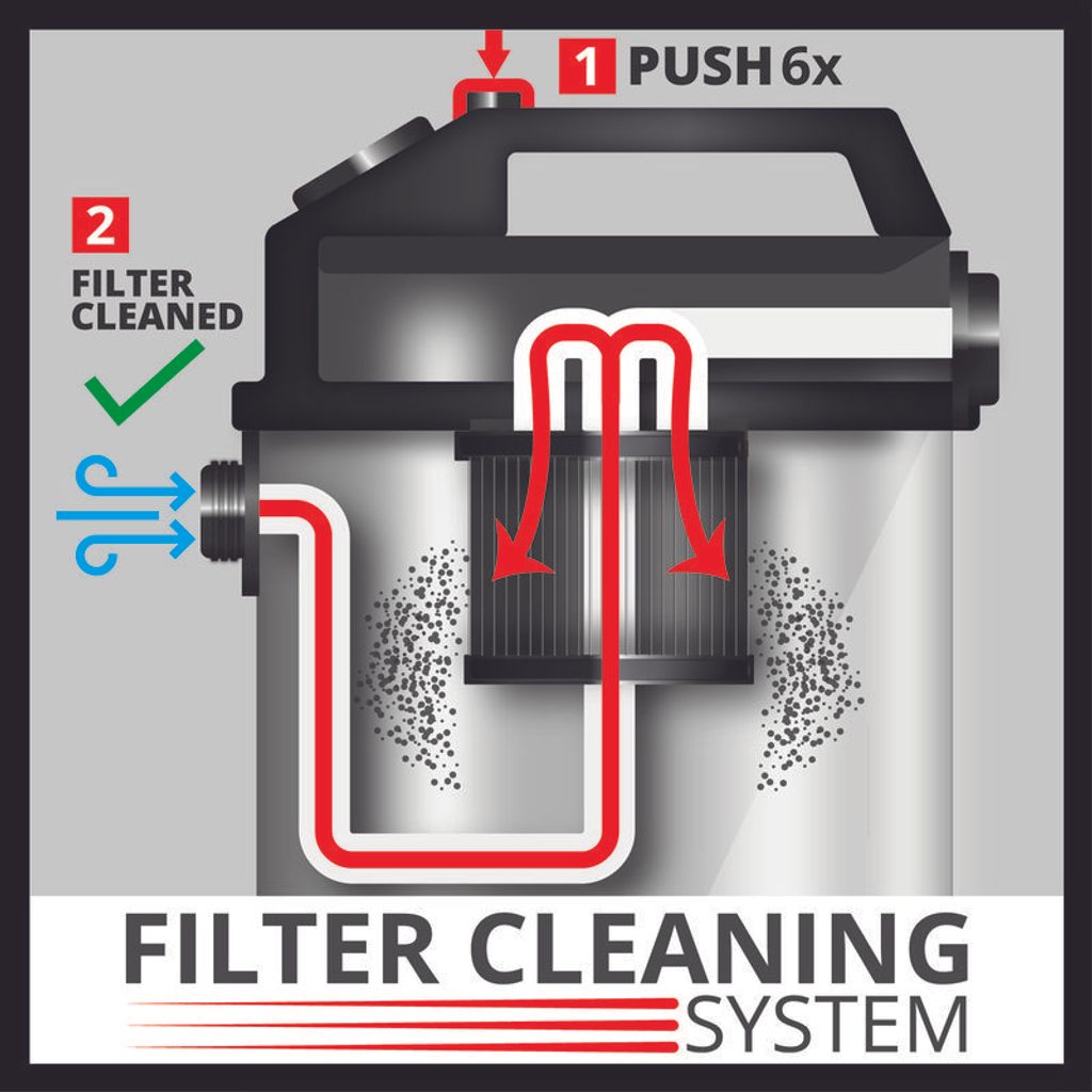 Systém čištění filtru obnovuje jeho plynule nastavitelný výkon. Sací výkon je plynule nastavitelný pomocí regulátoru otáček a funkce foukání pomůže při úklidu těžce dostupných míst. Abiciózní kutilové ocení mokrosuché sání i na staveništi nebo v jejich dílně. Pro snadné vypuštění nasáté vody slouží výpustný ventil.