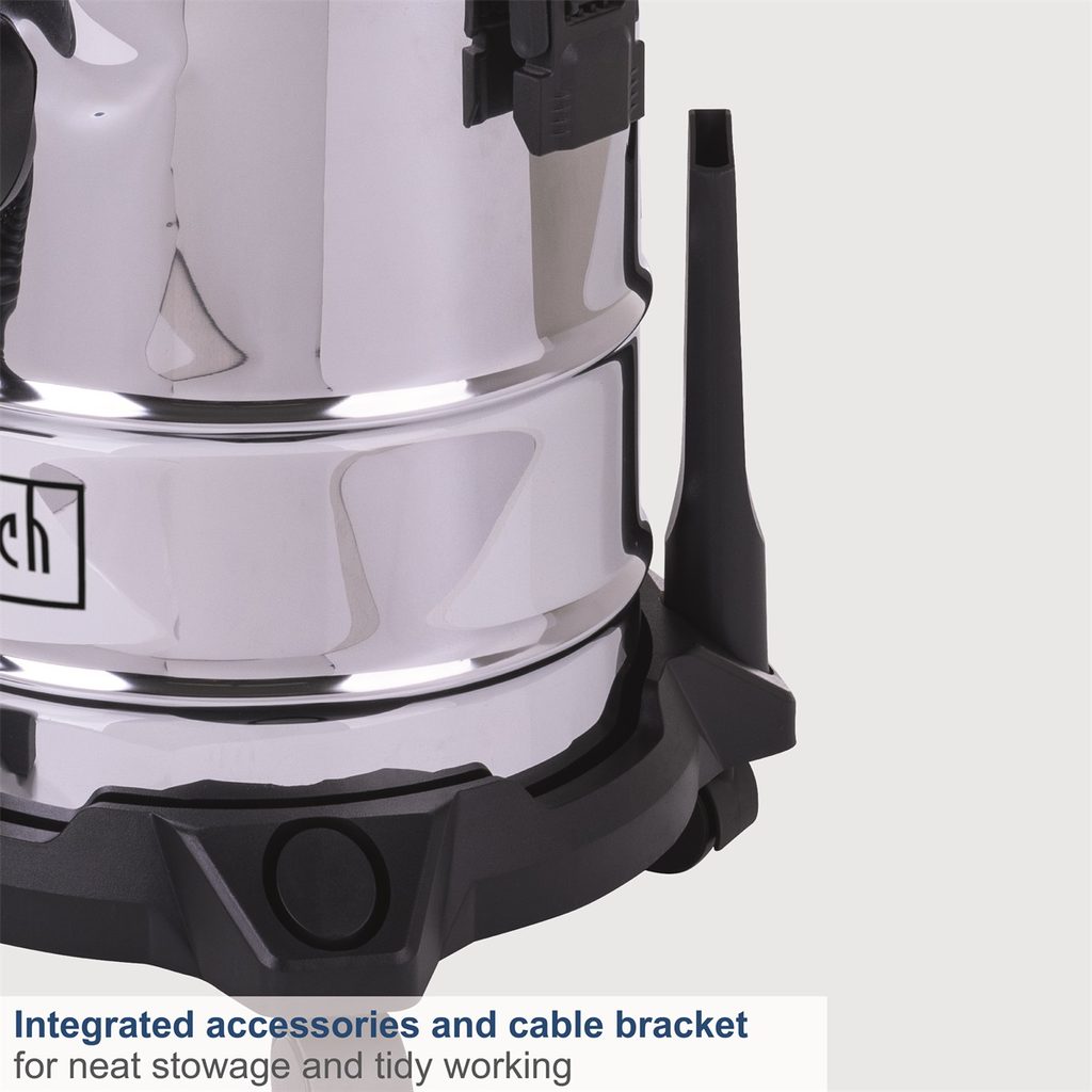 Srdcem vysavače je silný 1300W elektromotor, zajišťující dlouhou životnost a spolehlivý chod. Vysavač disponuje odolnou nádobou z nerezové oceli s objemem 20 litrů, která je vybavena rychloupínacím uzávěrem pro snadnou výměnu sáčku.