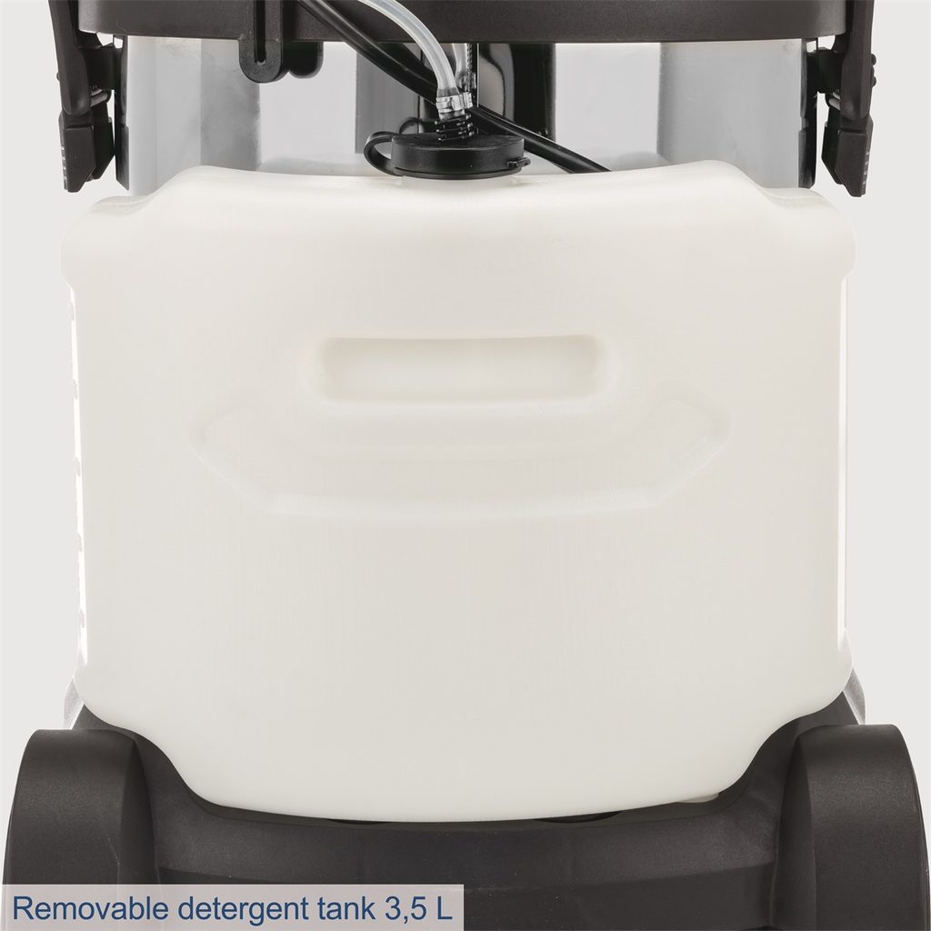 Stroj je vybaven praktickou hadicí, která usnadňuje stříkání i odsávání, a odnímatelnou nádržkou na vodu a čisticí prostředek s kapacitou 3,5 litru. Odpadní voda se shromažďuje v odolné nerezové nádrži o objemu 20 litrů, která je opatřena bočními uzávěry a výpustí na špinavou vodu.
