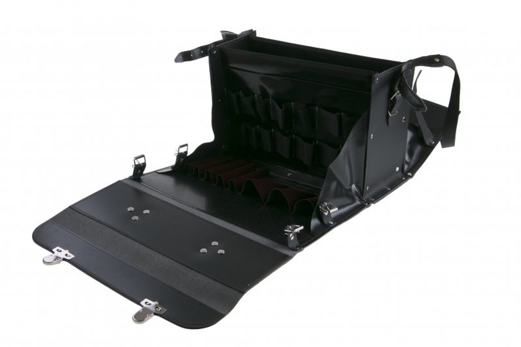 Unikátní konstrukce brašny umožňuje otevření jak přední, tak zadní stěny, což poskytuje snadný přístup k veškerému uloženému nářadí. Vnitřní uspořádání zahrnuje pět řad kapes, z nichž dvě jsou speciálně navrženy pro jemné nářadí a jsou vybaveny gumovými úchyty. Na předním dílu se nachází prostorná kapsa ideální pro dokumenty.