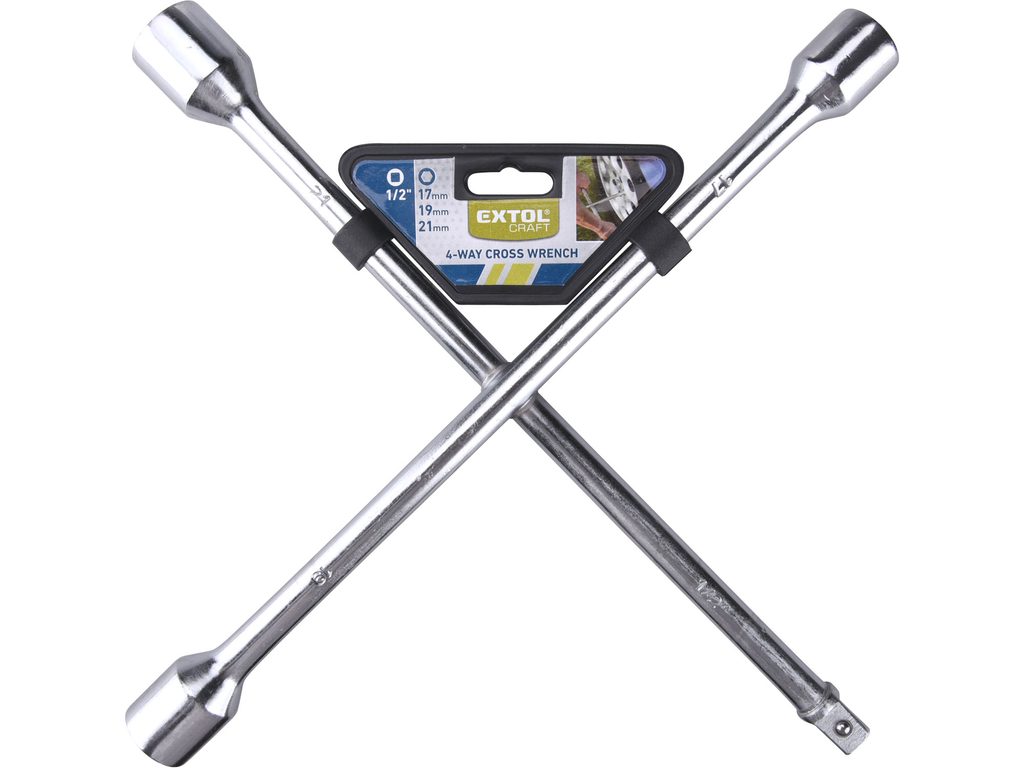 Křížový klíč na kola EXTOL CRAFT je univerzální nástroj vybavený čtyřmi různými velikostmi nástavců - 17 mm, 19 mm, 21 mm a 1/2". Tento praktický klíč je určen pro montáž a demontáž automobilových kol.