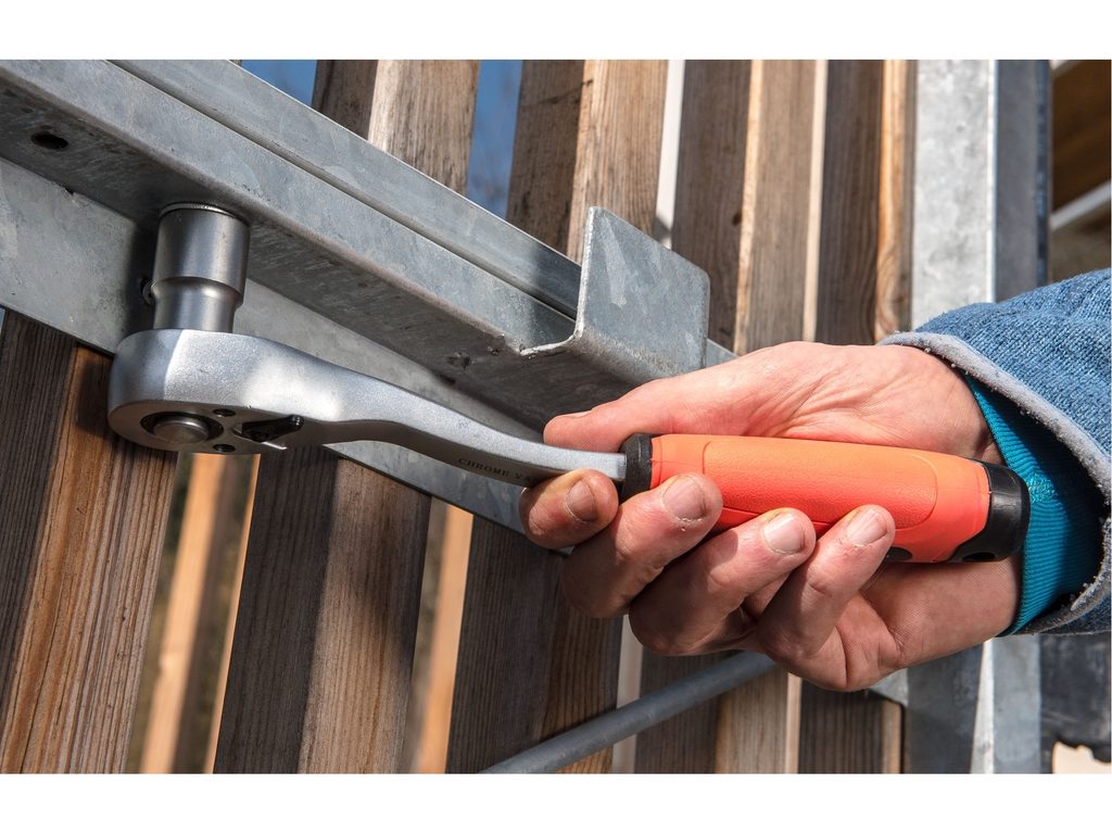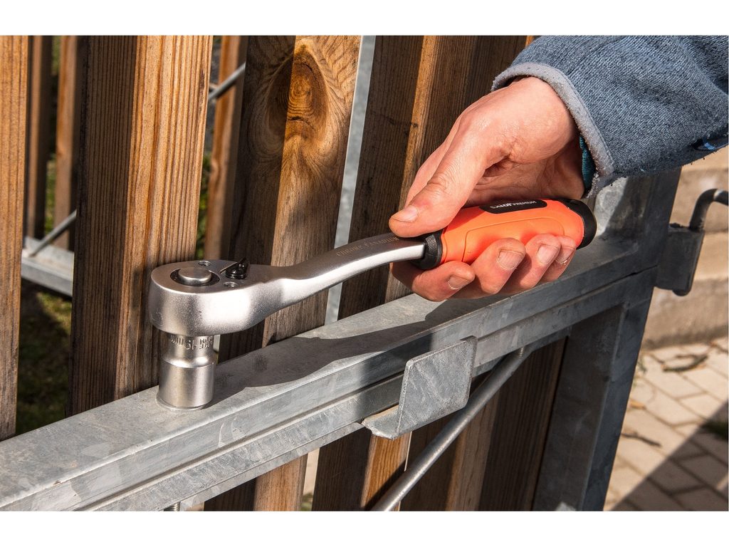 Ráčna 1/2" s přepínací páčkou a vyhazovačem. Je vyrobena z chrom vanadové oceli s ergonomicky tvarovanou rukojetí potaženou plastem.