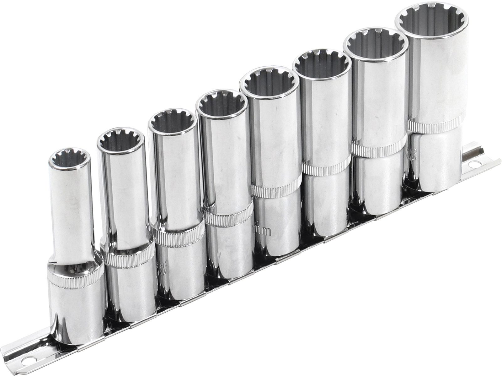 Sada nástrčných prodloužených hlavic s profilem MultiLock™, který je charakteristický dvanácti oblými vnitřními výstupky, lze použít jak pro klasické 6-ti hranné šrouby a matice, tak pro 12-ti hranné a jiné atypické např. palcové, křídlové, E-TORX, dvojitý E-TORX, XZN, čtyřhran atd. Na kolejničce s možností připevnění na stěnu.