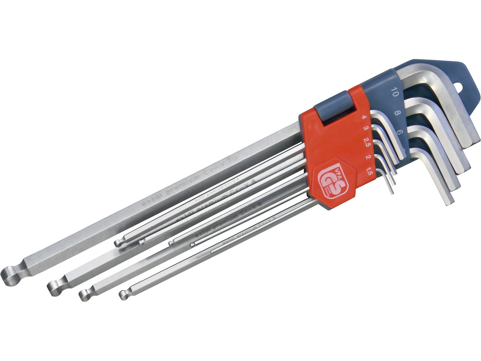 Klíče jsou uloženy v praktickém plastovém držáku s přehledným značením velikostí, což usnadňuje jejich organizaci a výběr správného klíče při práci. Prodloužená verze klíčů umožňuje pohodlnou práci i na méně přístupných místech.