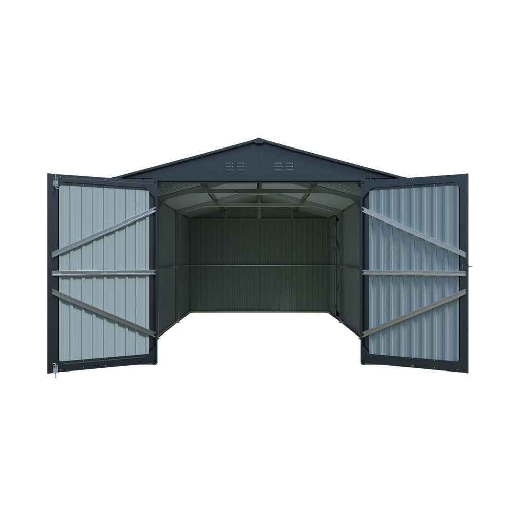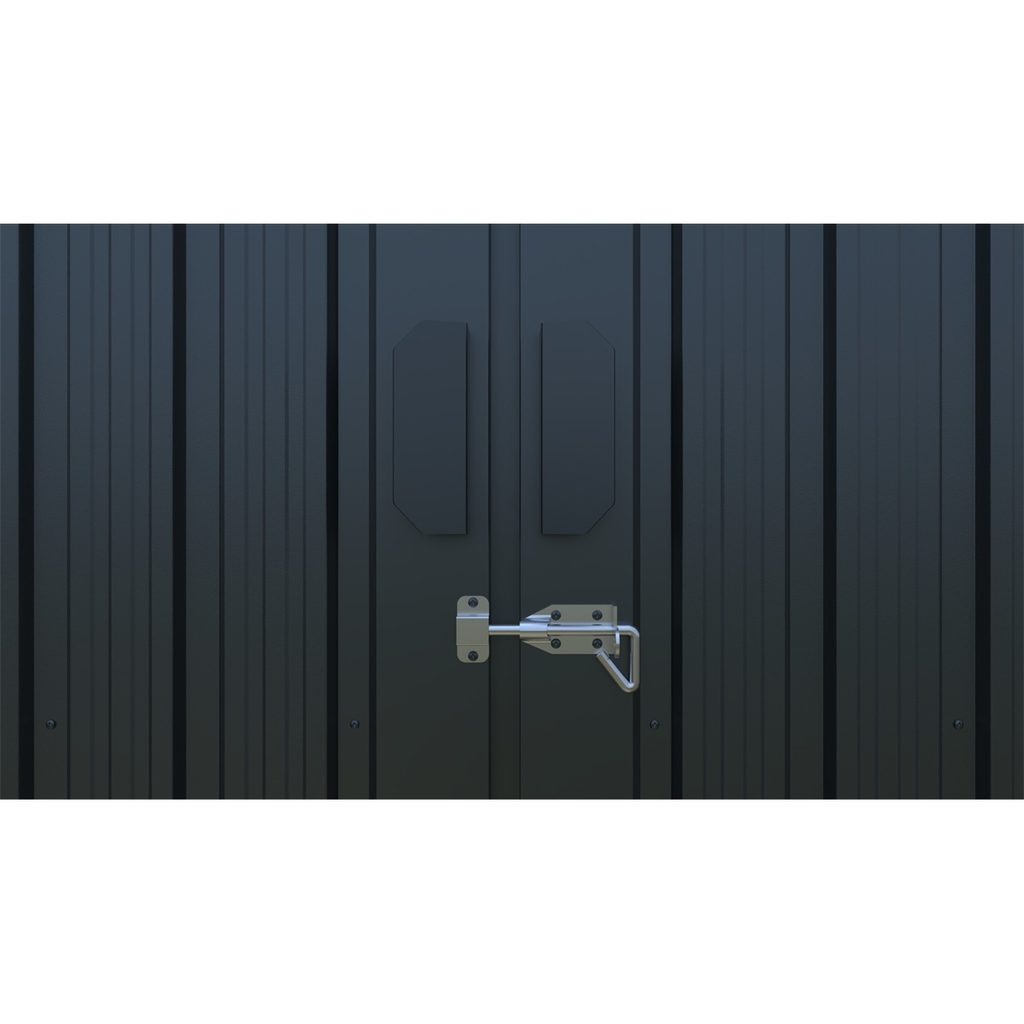Garáž/domek je vybavena vysokými dvoukřídlými dveřmi s madly, které umožňují snadný vstup a manipulaci s většími předměty. K dispozici jsou také boční jednokřídlé dveře, které lze spolu s hlavními dveřmi bezpečně uzamknout pomocí dodávaných zámků. Pro zajištění dobrého proudění vzduchu a ochranu před vlhkostí jsou v garáži/domku umístěny čtyři větrací otvory.