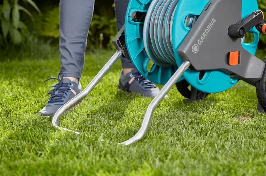 Speciálně tvarovaný rám zaručuje vysokou stabilitu vozíku. Usnadňuje to zavlažování, protože vozík na hadici zůstává na místě dokonce i při odvíjení hadice. Stopka proti odkapávání zabraňuje vytékání vody po použití nebo při přepravě hadicového vozíku. Úhlová přípojka uvnitř bubnu zabraňuje ohnutí hadice. Tím je důsledně zaručen maximální průtok vody.