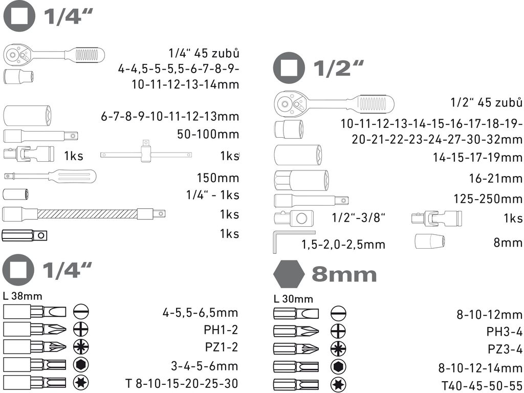 Díky různorodému složení sady z nejpoužívanějších rozměrů ořechů a hrotů je sada užitečný pomocník do jakékoli dílny. Jednotlivé části této sady jsou vyrobeny z kvalitní kalené oceli nebo CrV.