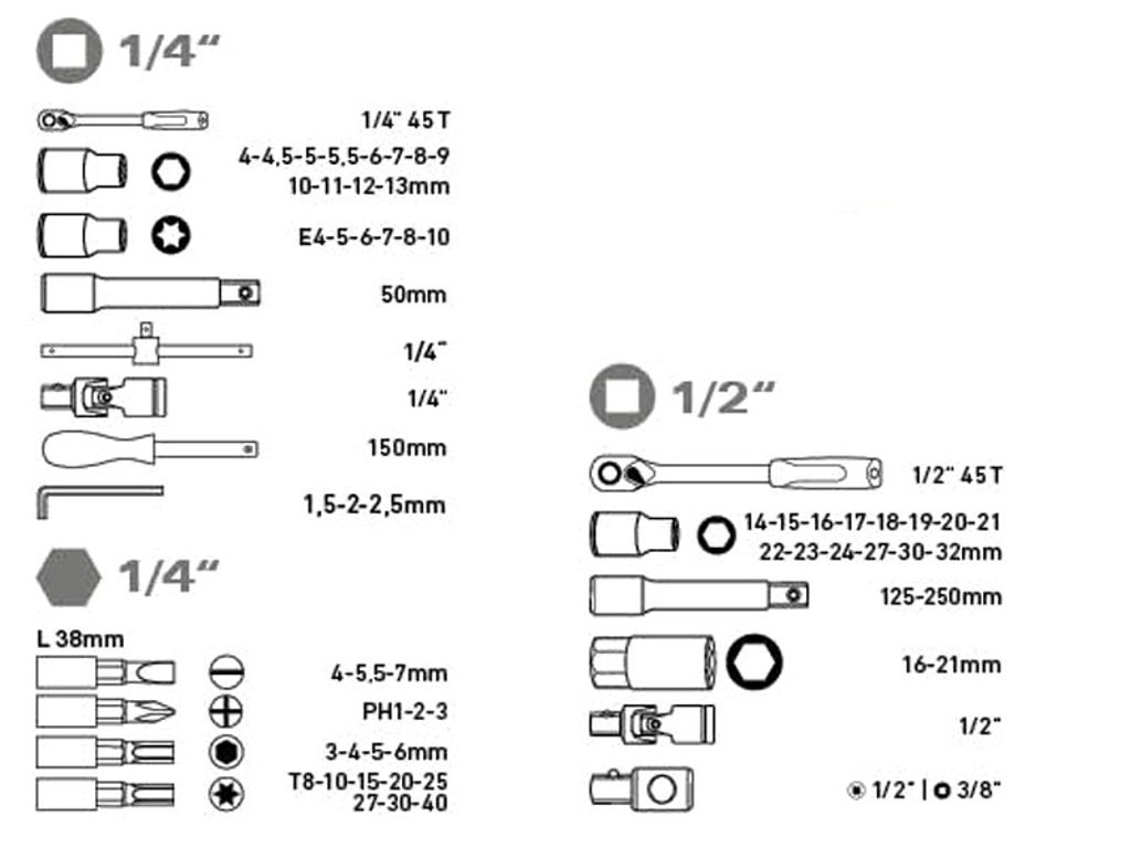 Gola sada v kovovém kufříku skládající se ze 65 dílů s velkou ráčnou 1/2" palce i malou ráčnou 1/4“ palce a nástrčnými hlavicemi k oběma rozměrům. Kromě krátkých a dlouhých nástrčných hlavic také obsahuje klíč na motorové svíčky.