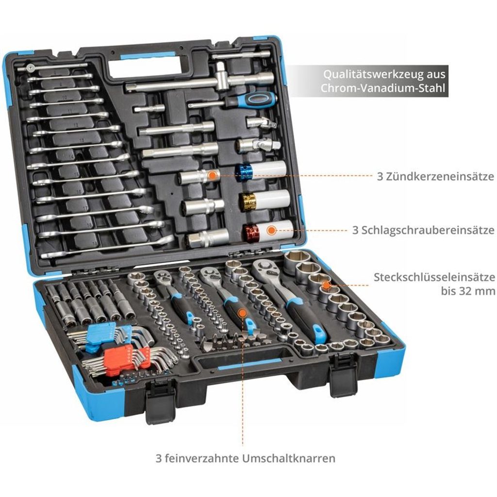 157 dílná sada nástrčného klíče a nářadí z chromvanadiové oceli v praktickém kufříku. Očkoploché klíče se 3 ráčnami (1/2", 3/8", 1/4"). Dále pak praktický kufřík obsahuje krátké i dlouhé nástrčné hlavice, hlavice na zapalovací svíčky, vratidla, nástavce a adaptéry. 3 nástrčné rázové utahovací hlavice. Součástí jsou také vratidla ¼“, ½“ a velký sortiment bitů ve 2 různých řadách (6,3 mm a 8 mm).