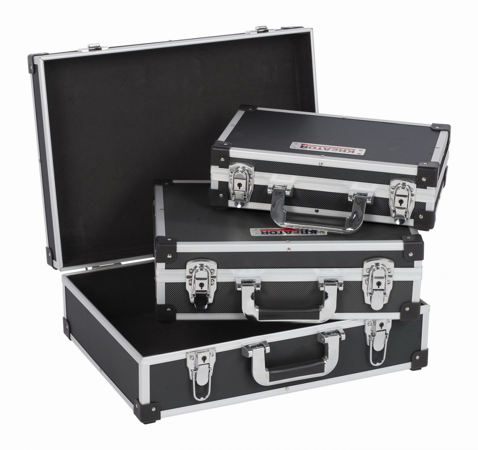 Praktická sada tří profesionálních hliníkových kufrů Kreator v černém provedení. Každý kufr má robustní konstrukci a je vybaven bezpečnostním uzamykacím systémem pro maximální ochranu uloženého nářadí a příslušenství.