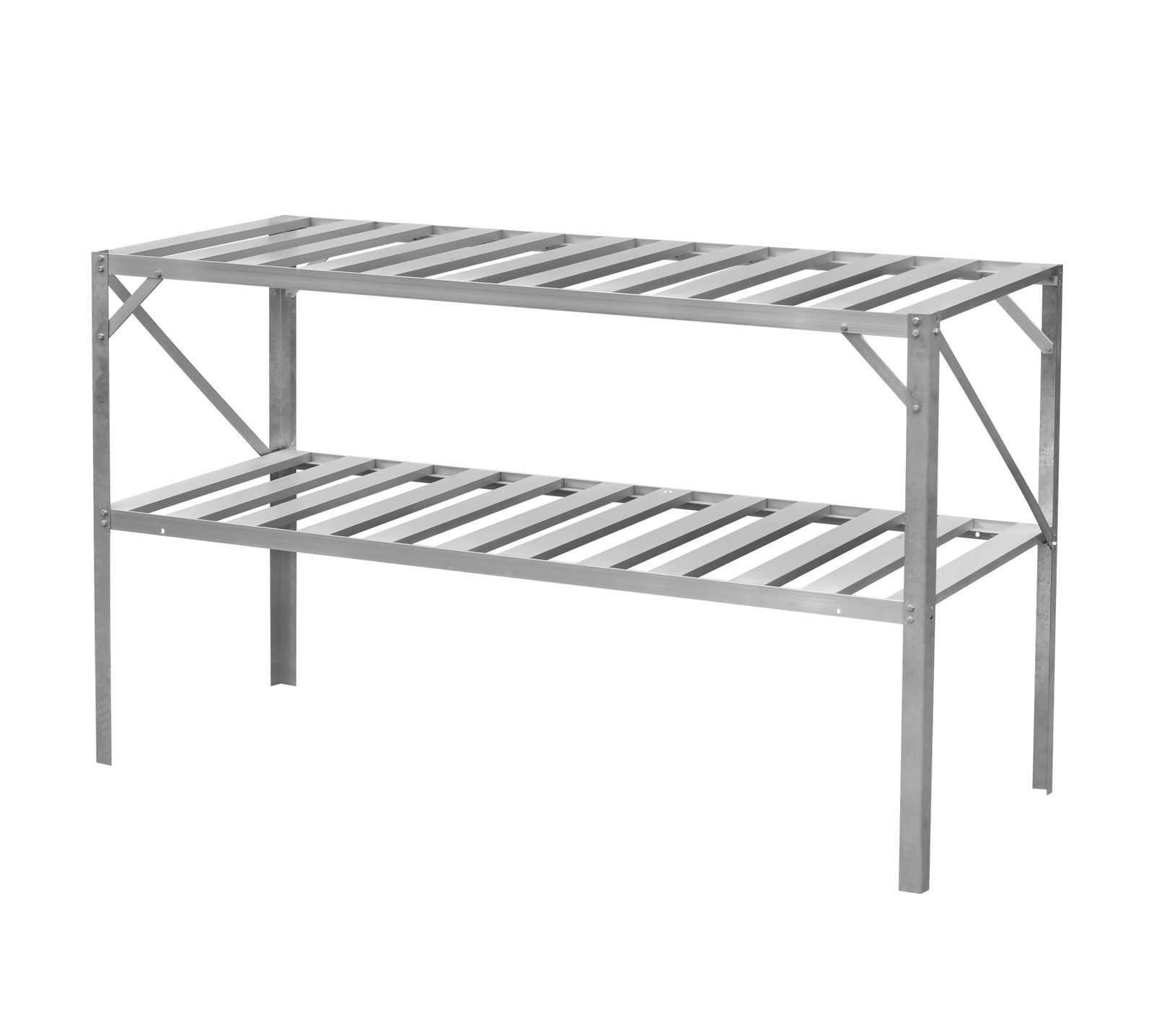 Celohliníkový dvoupolicový regál stojící na zemi. Vhodné pro skleníky všech typů. Univerzální produkt. Dodáváme v rozebraném stavu jako stavebnici.