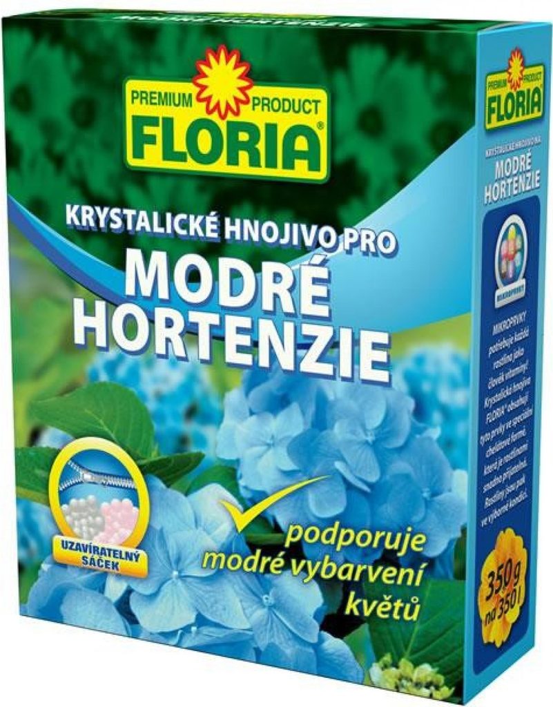 FLORIA krystalické hnojivo pro modré hortenzie obsahuje velmi účinné a rychle působící vodorozpustné hnojivo pro všechny druhy hortenzií, navíc obsahuje speciální formu živin, která podporuje modré vybarvení květů hortenzií.