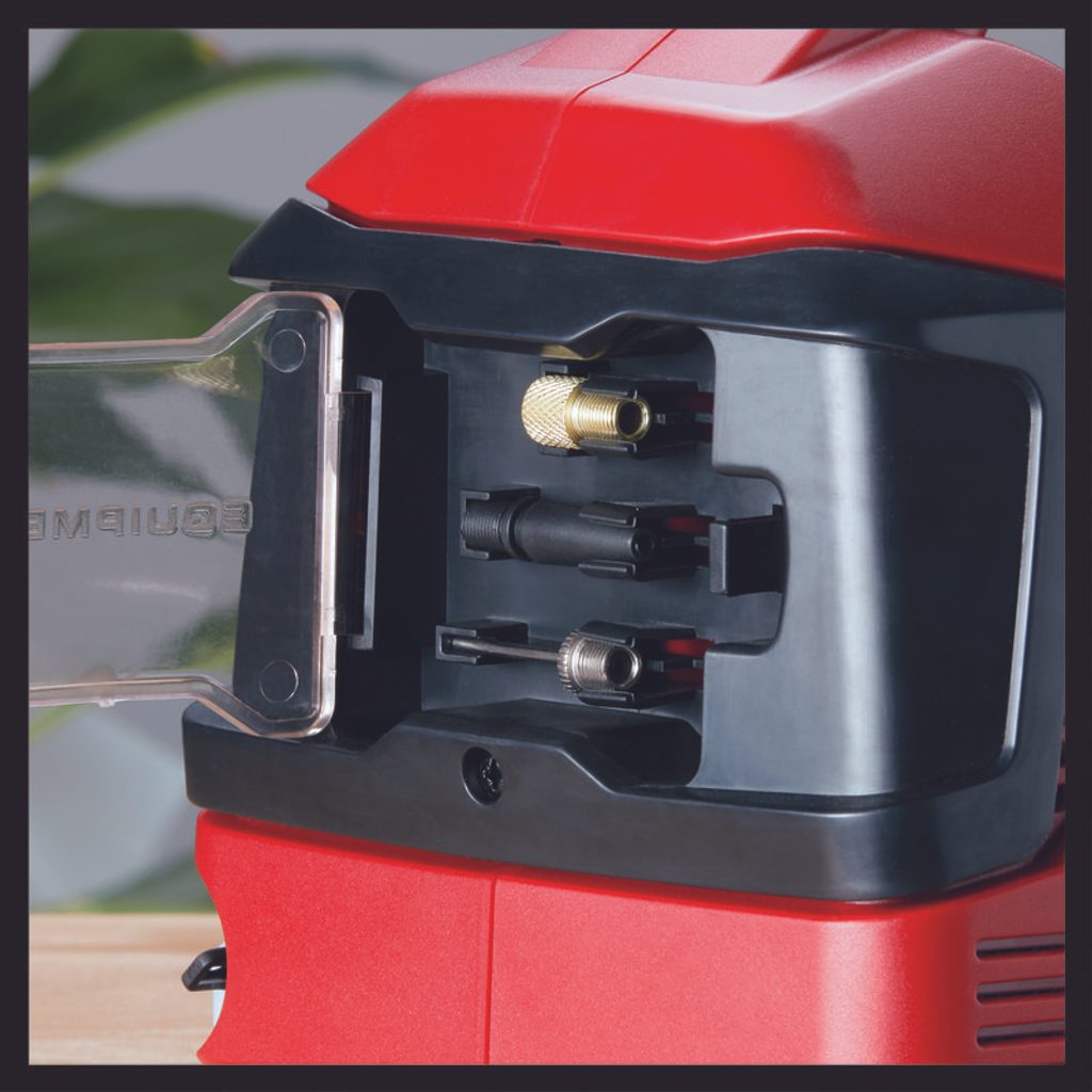 Stisknutím tlačítka lze vysokotlakou funkci přepnout na nízkotlakou. Součástí dodávky je 3dílná nafukovací sada s adaptéry pro pneumatiky motorových vozidel a duše jízdních kol, pro fotbalové a basketbalové míče stejně jako pro nafukovací matrace a gumové čluny.