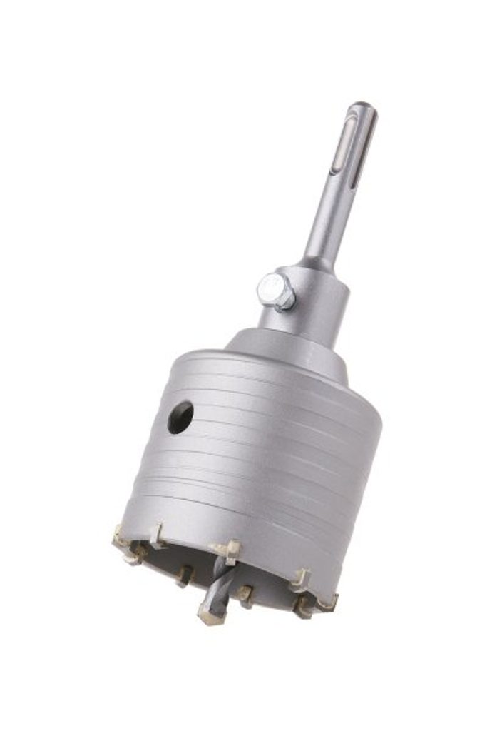 Vykružovací / vrtací korunka s SK plátky a vodícím vrtákem uchycení SDS+ kvalitní SK plátky (SK - slinutý karbid), dlouhá životnost.