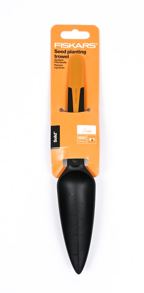 Lopatka na setí semen Fiskars Solid nabízí v jednom lehkém a odolném nástroji čtyři základní pomůcky na výsev semen. Unikátní lopatka obsahuje lžičku na osivo, ostrý hrot, rozšiřující lopatku a měřítko. To vše je integrované v jednom dvoudílném nástroji.