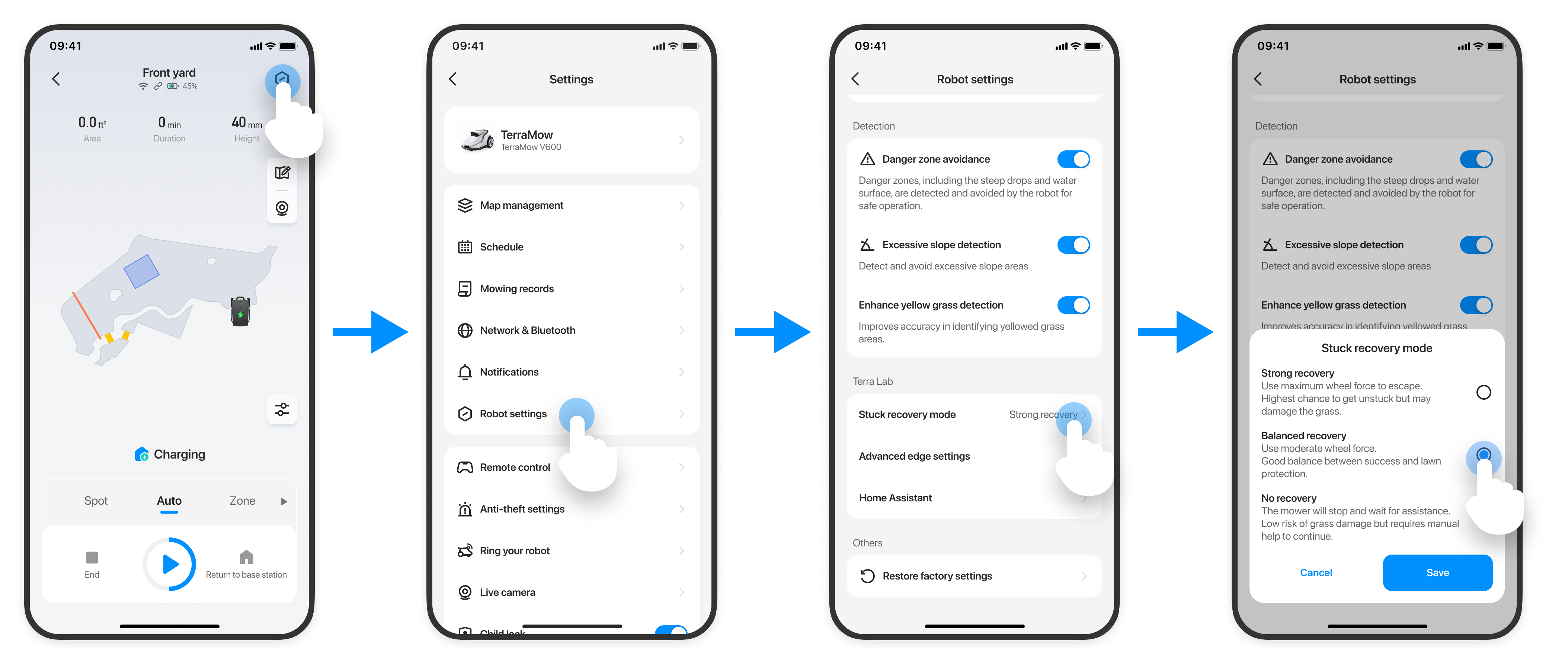 Pokud se robot zasekne, můžete ho uvolnit pomocí dálkového ovládání v aplikaci — není nutné chodit ven.