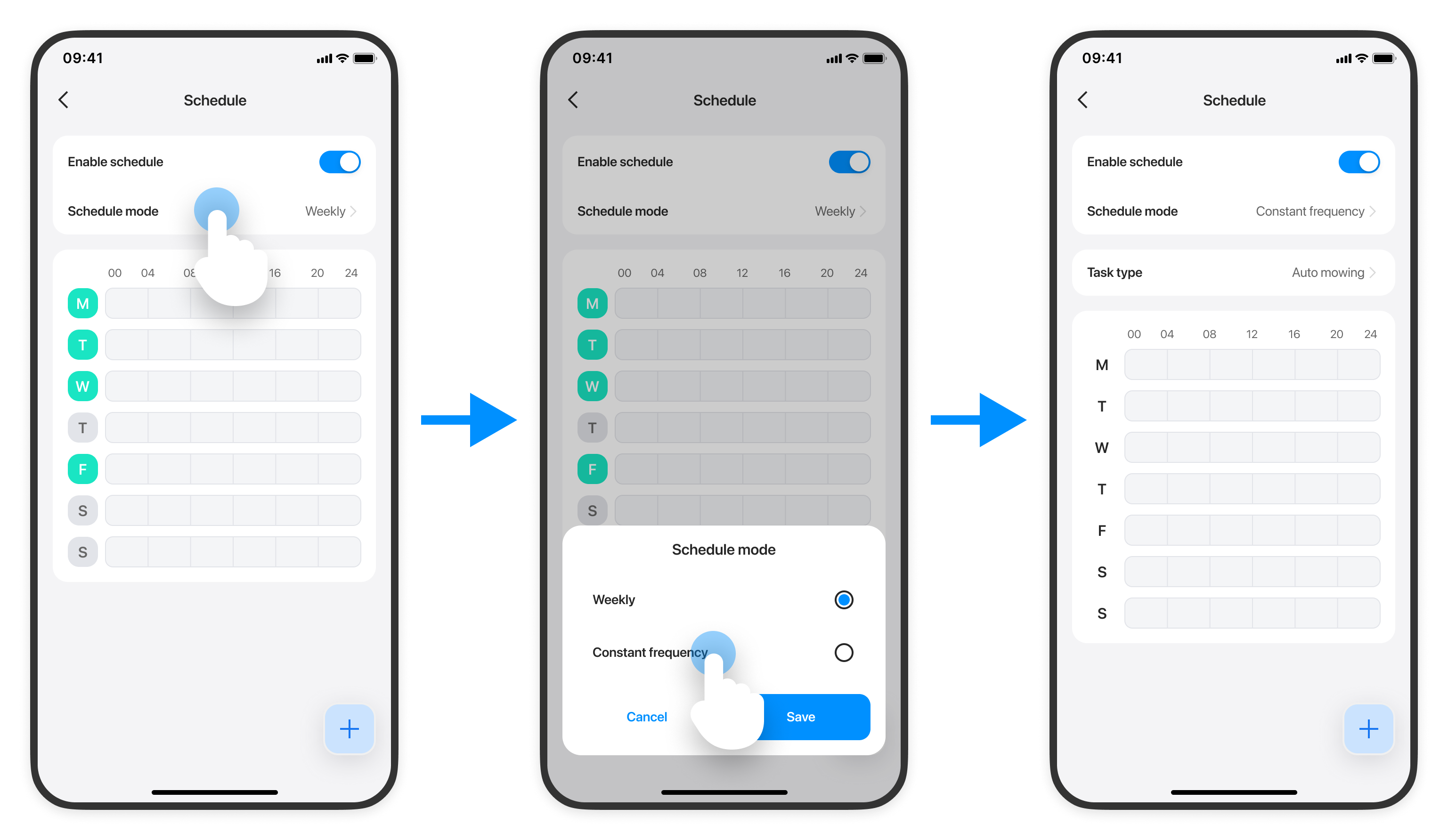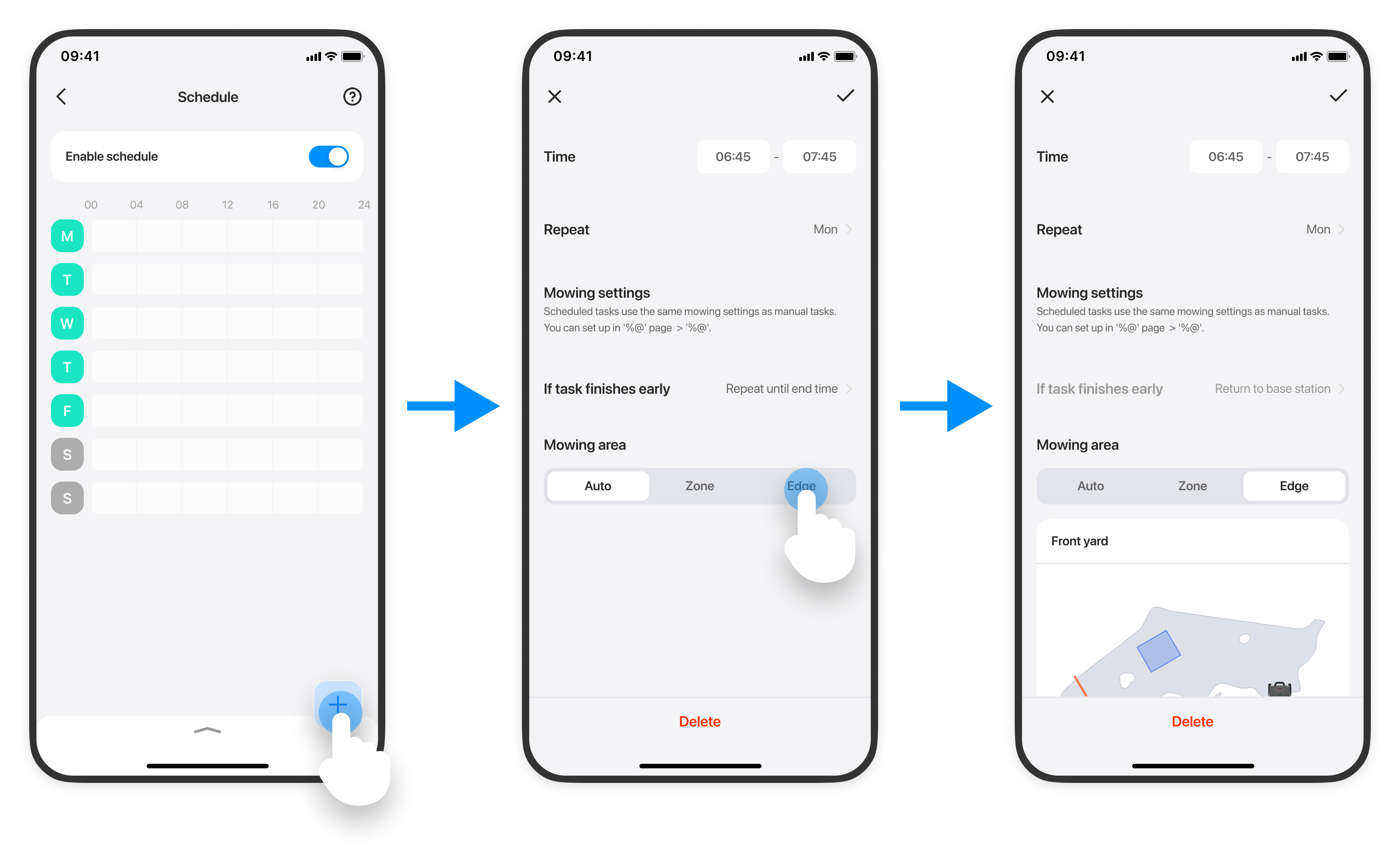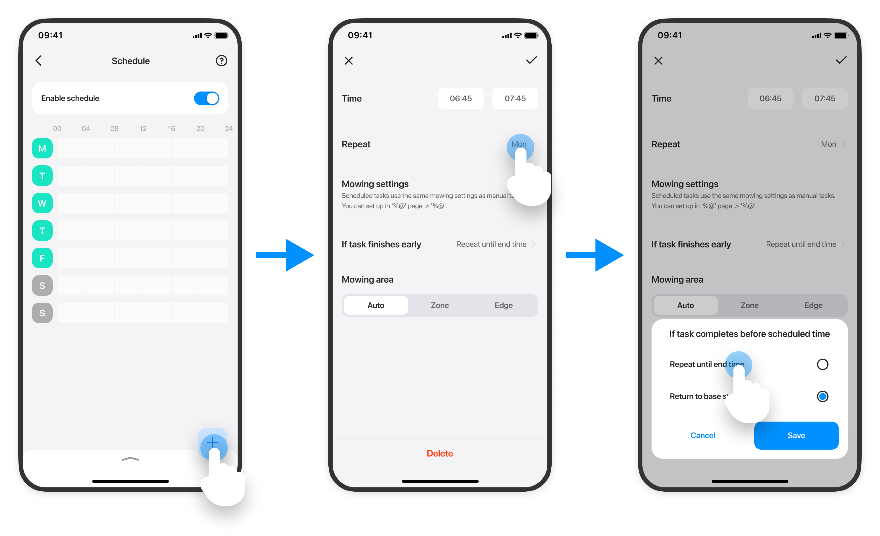 Pokud robot dokončí minulé sečení dříve, může další spuštění v plánu začít od nuly, ne jen dokončením zbytku.