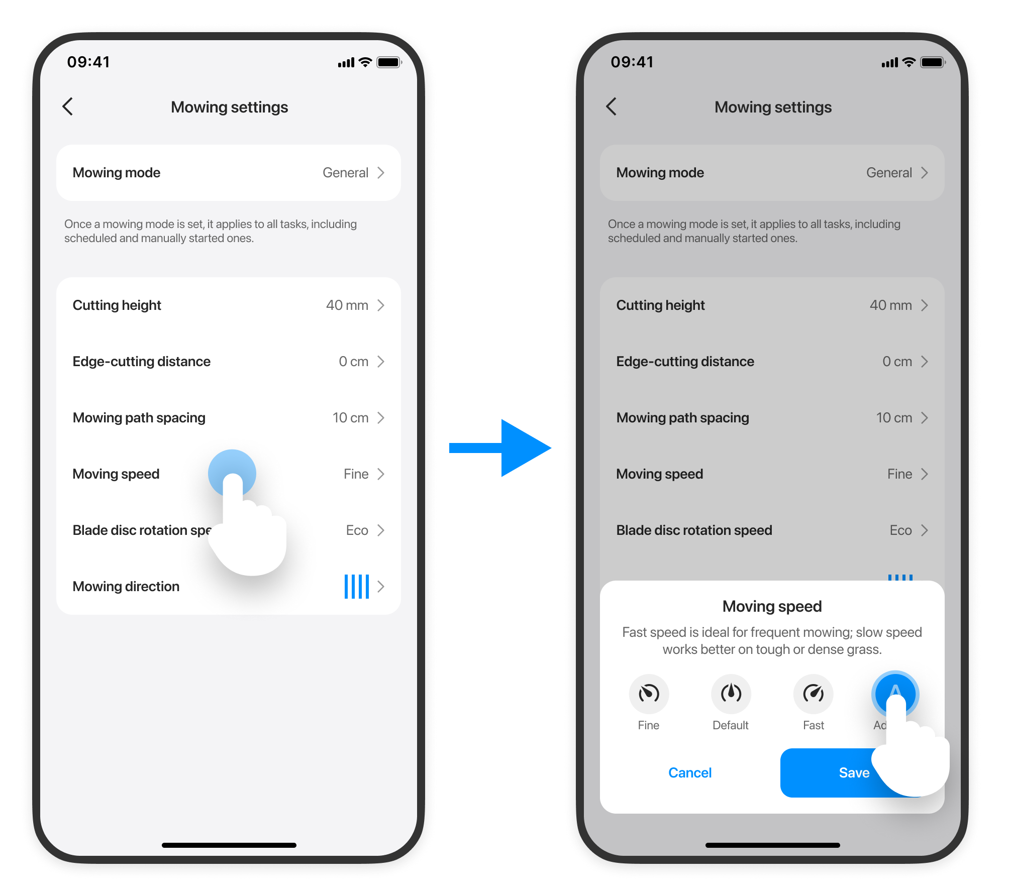 Nový režim Adaptive Speed automaticky zpomalí pojezd v hustší trávě.