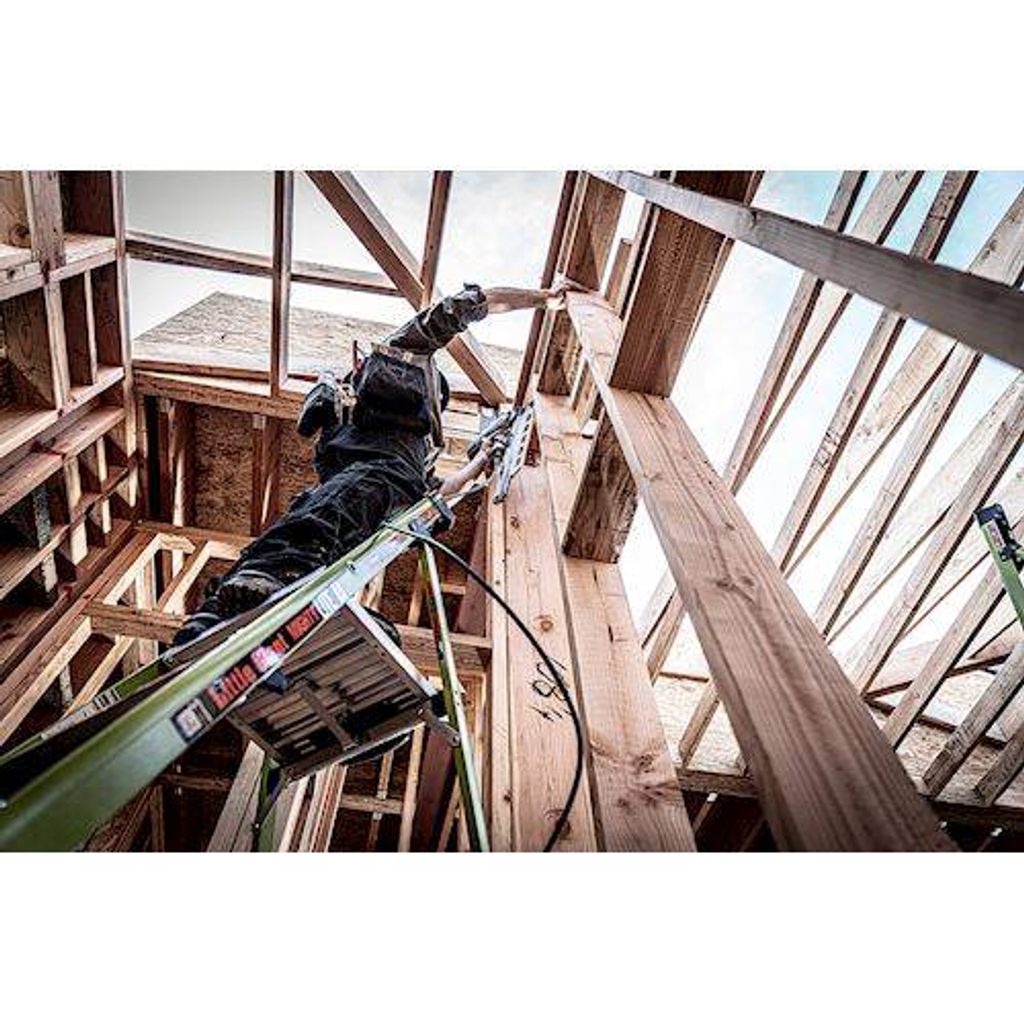 Žebřík je vyroben z pokročilého sklolaminátu Fiberglass, který je o 15 % lehčí než tradiční sklolaminátové žebříky, což významně snižuje riziko zranění při manipulaci a přepravě. Výrazná Hi-Viz zelená barva zajišťuje lepší viditelnost a minimalizuje riziko kolize s osobami či předměty během používání.