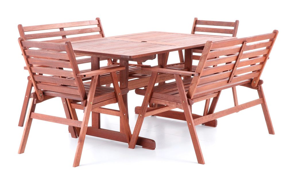 Zahradní sestava Monroo COMBI 6 VeGA představuje luxusní masivní stolovou sestavu, která se skládá ze dvou pohodlných křesel, dvou prostorných lavic a velkého stolu. Všechny části sestavy jsou vyrobeny z exotického, mimořádně trvanlivého a tvrdého dřeva meranti, které se vyznačuje dlouhou životností, vysokou odolností a atraktivní kresbou.