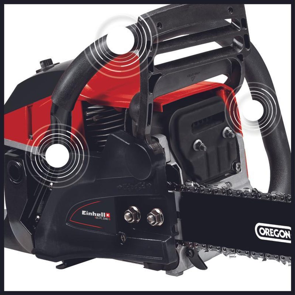 Společnost Einhell při vývoji této pily kladla velký důraz na kombinaci výkonu, ostrosti a bezpečnosti s jednoduchostí obsluhy. Díky použití kvalitní lišty a řetězu značky OREGON je zajištěna vysoká účinnost a dlouhá životnost. Přítomnost antivibračního systému znamená, že práce s pilou je méně unavující a bezpečnější.