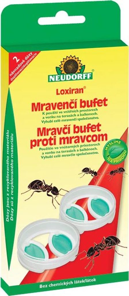 NEUDORFF Loxiran Mravenčí bufet - doplňovací návnadová dóza s účinnou látkou spinosad je určena k účinné likvidaci mravenců ve vnitřních prostorech a venku na terasách a balkónech. Dózy je třeba umístit do blízkosti mravenišť nebo na mravenčí stezky. Nedávejte dózu na přímé slunce. Po požití návnady dělnicemi, larvami a královnou dojde k postupnému vyhubení celého mravenčího společenství.